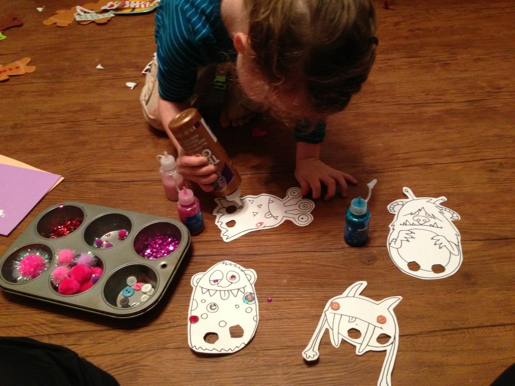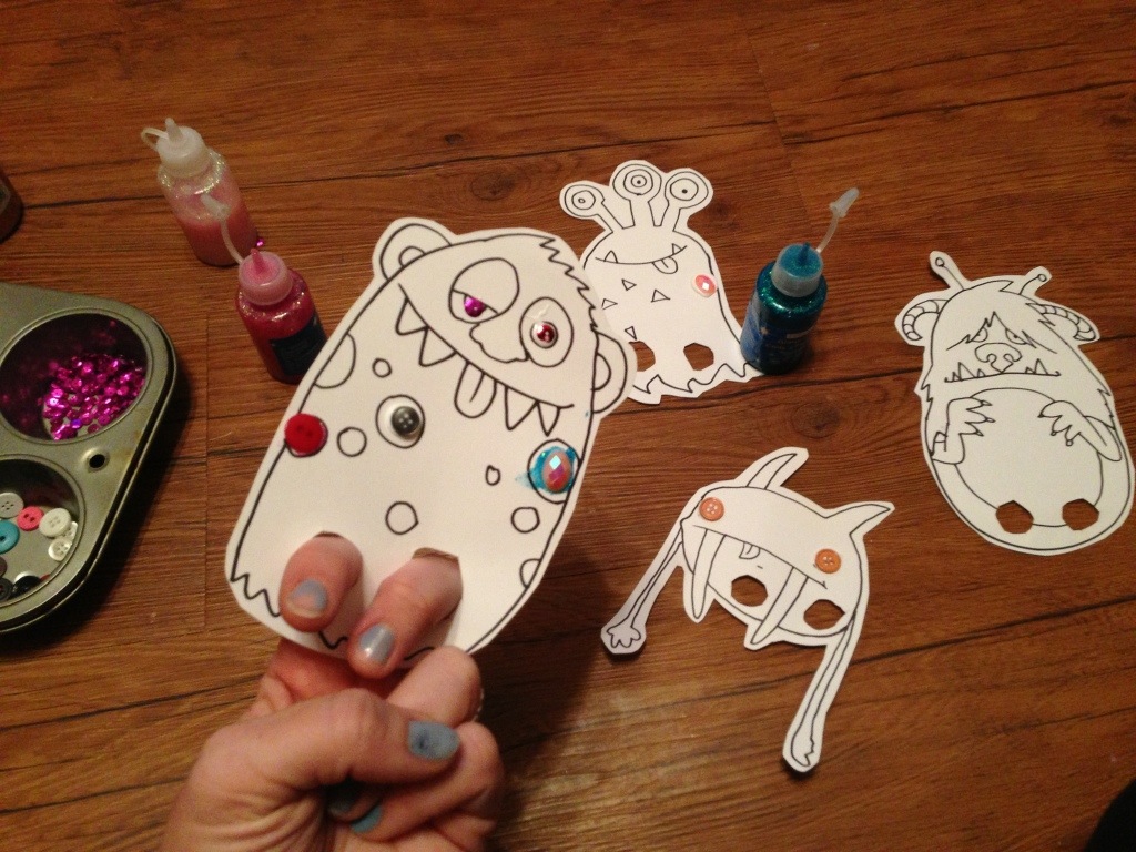 Remember finger puppets? We were looking for a kid-friendly project one day, and I remembered these. I got some white card stock, doodled a few monsters (with no legs, of course), and cut holes out for little fingers. The fun part was letting her decorate them. I put a variety of sparkles, sequins, plastic jewels and puffs in a muffin tin and let her go wild!