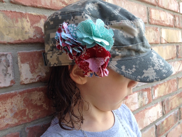 I got a regular ACU hat, and took a nametape (that my friend Ashley D made for a craft show, but that you can order from any clothing sales or alterations store) and stuck it on the back. (In aviation, the term “stick buddy” is like your copilot, your pal.)  I found an easy flower tutorial on Pinterest and threw a few quick flowers together (my daughter picked the colors).  Ashley’s cool tip was that the flowers are actually PINNED on (in our case, with a bobby pin) so you could change them out later if you want.  And there ya go!