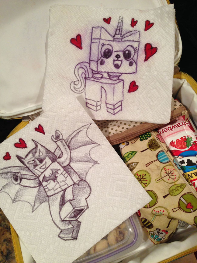 Wow!  Last week on Facebook, I posted some of the napkin doodles I do for Myla’s lunches, and it got so many positive comments!  So I thought I’d share some other lunchtime doodles with you.