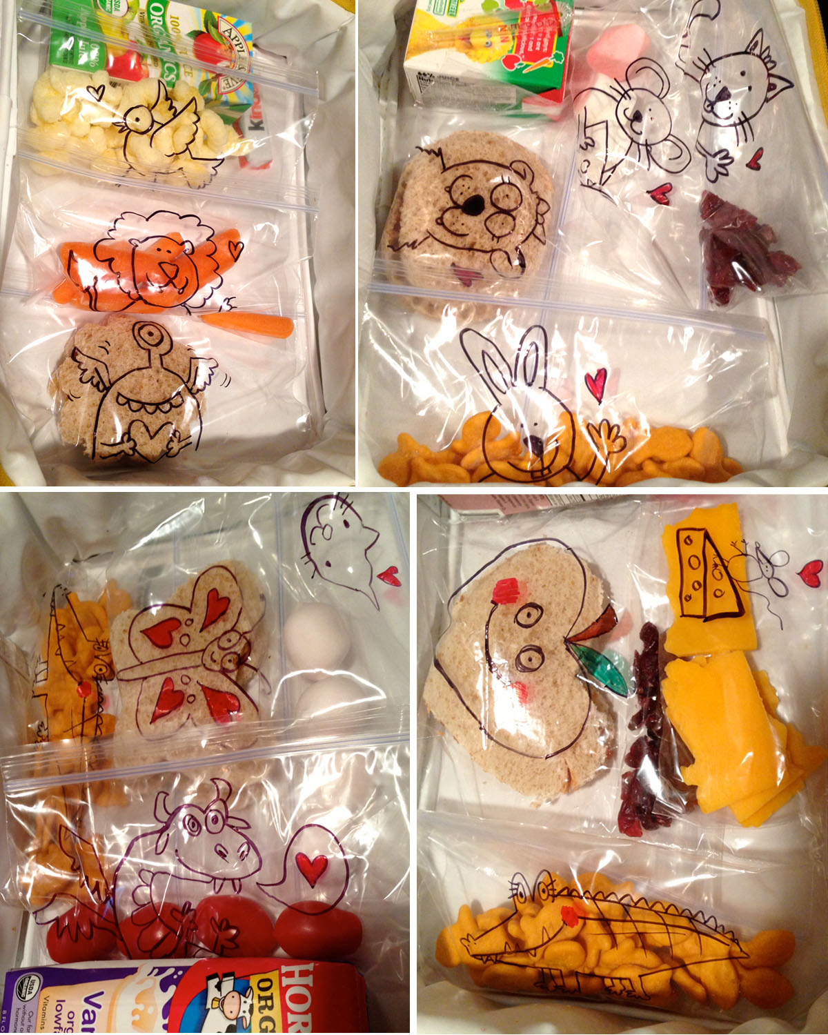 I would make similar lunches for my daughters. The sandwiches would have cookie cutter trimmings, I would leave them notes telling them to have a great day, and that I loved them. I would peel the orange our apple in a circular fashion so that it would come off as a curly cue, and I would draw designs on their paper bags until the plastic bags came out andI decorated them with permanent marker. My girls were always thrilled to boys to know that their lunches were special.
