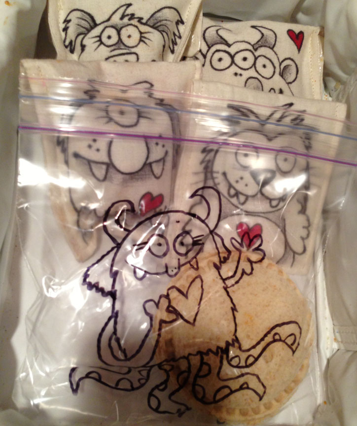 I often visit her at lunch (which she loves), and for her birthday, I decorated her bags with little birthday alien monsters: