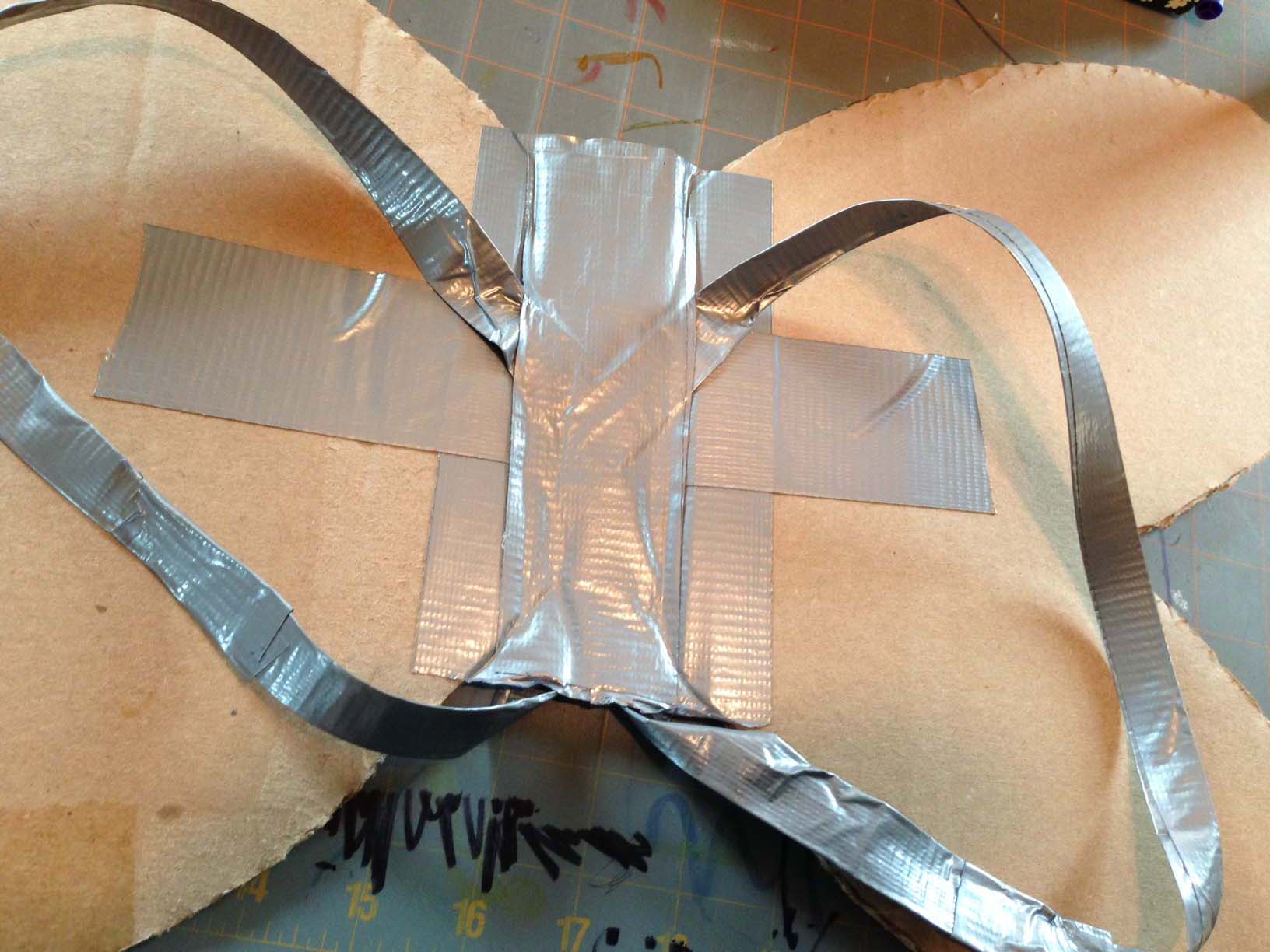 Okay, finally my stalling had paid off, and I had a chance to think it through…Maybe I didn’t plan this out very well (or at all), and maybe I was using last-minute materials.  But what works best when you have nowhere else to turn?  I’ll tell you, my friends:  DUCT TAPE.  I made a “bridge” of sorts, connecting the two wings together.  Then I constructed a set of “backback straps” by folding a piece in thirds for the strap, and first: taping them on the top of the wing bridge.  I did it at a bit of an angle, so they’d fit around her shoulders pretty smoothly.