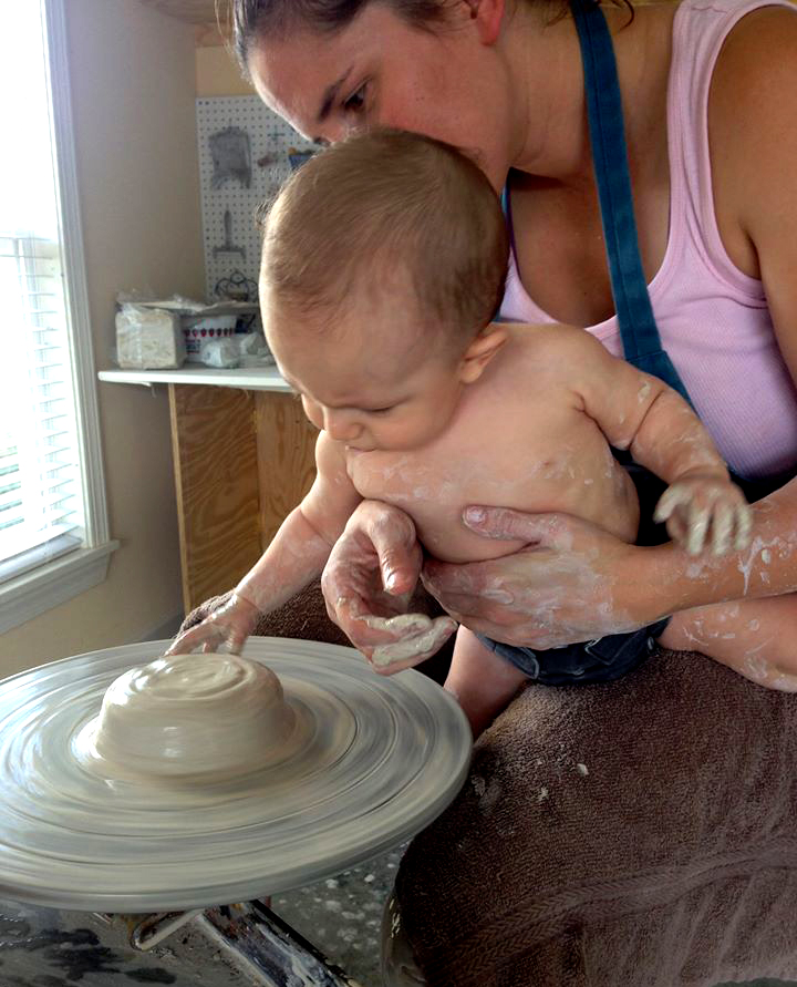 Brandy in her pottery studio with her son, Connor, getting messy with some clay.  Love it!