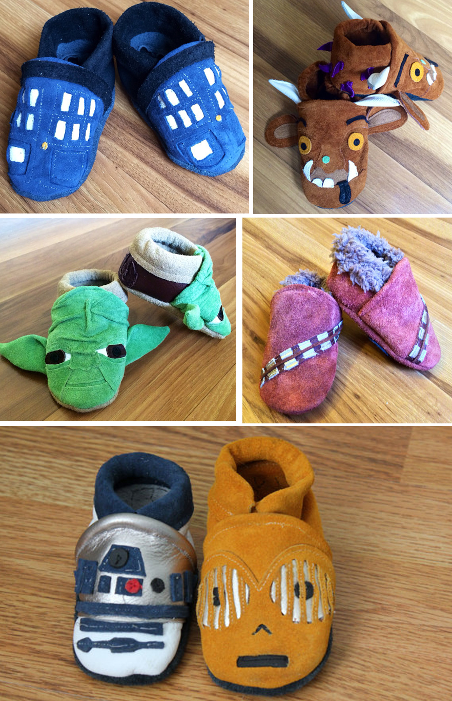 Brandy can make pretty much anything you want onto these little shoes!  She’s done the Tardis, a Gruffalo, Star Wars-inspired shoes, ones with interchangeable bows, biplanes, team logos, and all sorts of other adorable creations.  She’ll do pretty much any size you want.  And she LOVES a challenge!