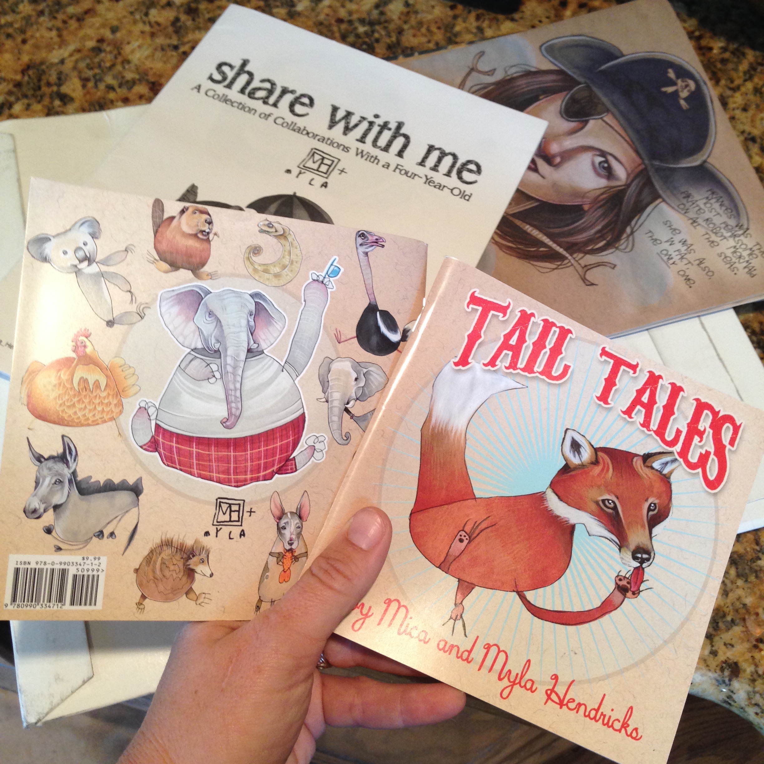The little animal story booklet is completely finished, and waiting to be shipped.   I think it’s quite cute!  I read it to Myla (who had never seen the stories all put together), and she loved it!  Although she was a bit critical of the fact that I apparently swapped the gender of some of the characters in the stories I wrote, which displeased her.  I tried to explain that I changed it up a bit for the fun of the stories, I did the best I could, and that it’s too late and the books were already printed, but she was still a little miffed.  So if you all could just mentally change the genders of the giraffe, bear, the zebra, the pig, and the cow when you read it, that’d be great.  (Insert exhausted parental eyeball roll here, accompanied by a huge SIGH.)