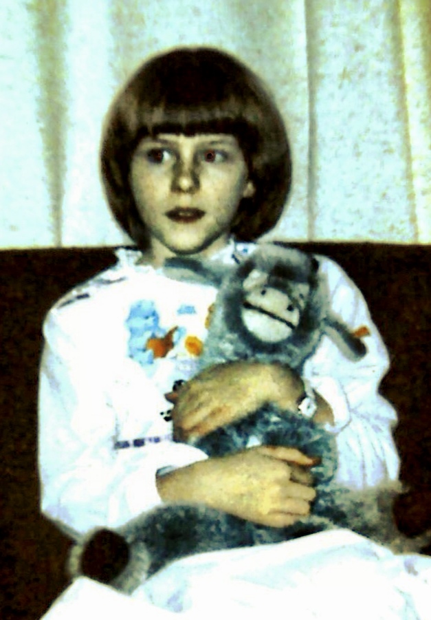 Me in my Care Bears jammies with my Prince Valiant ‘do, and a brand new Donkey.