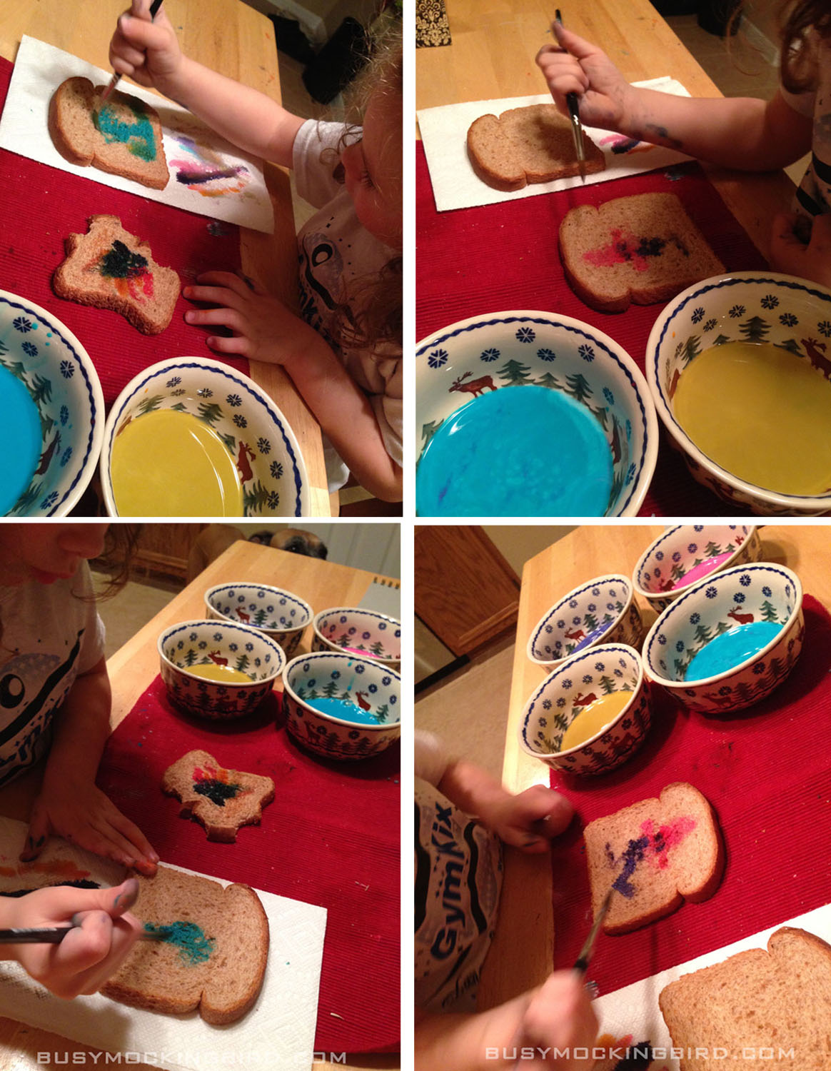If you’ve never seen the hundreds of Pinterest posts on it, milk painting with kids is actually pretty fun!  Put milk in bowls.  Add food coloring.  Let ’em paint on bread.  Toast & eat.  Easy peasy!