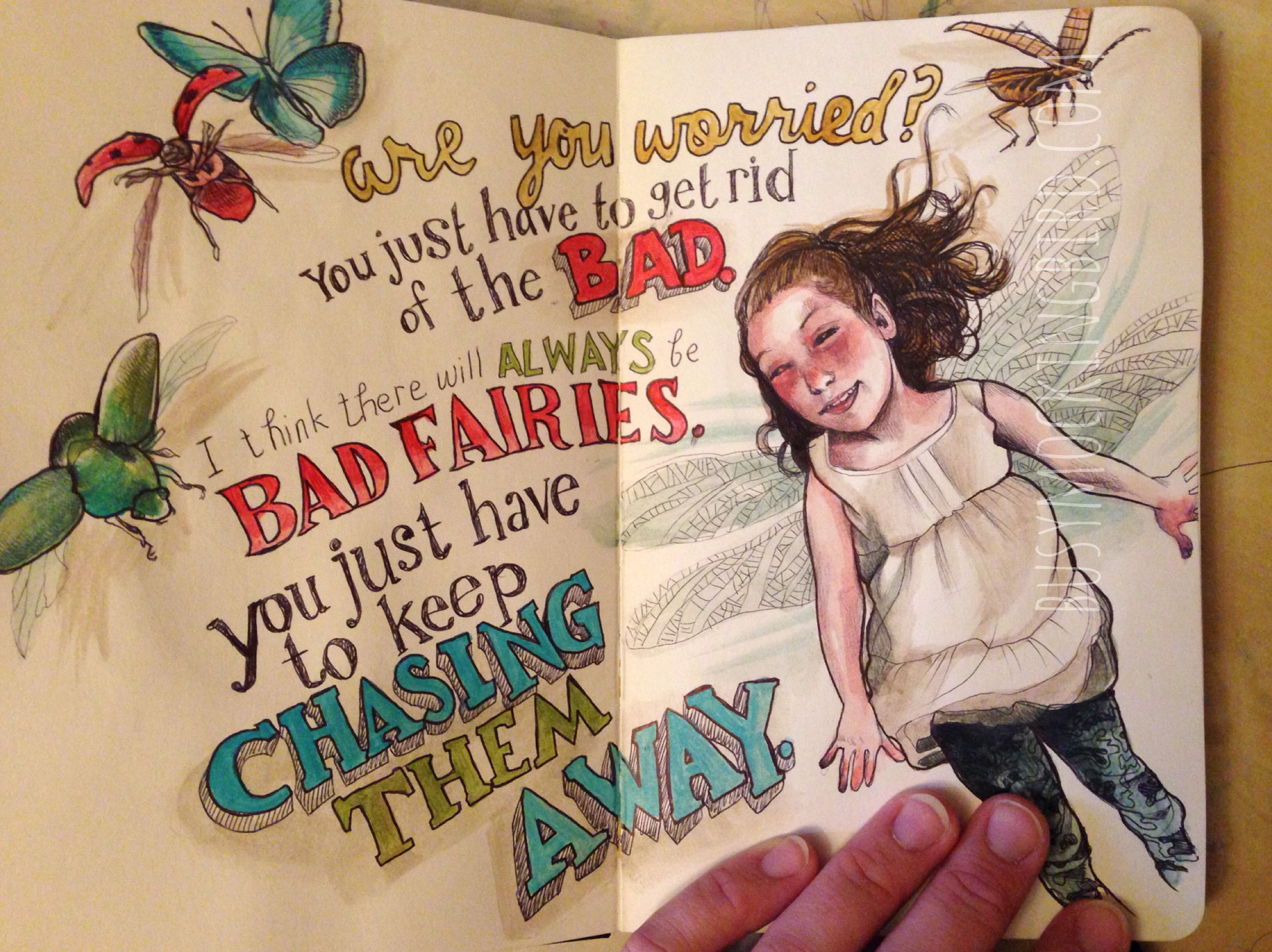 So now that she’s older, and she’s saying all the wonderful things kids say, and my little Paper Coterie book is already full of little wonderful things she’s ALREADY said, I was reminded of my old sketchbook journals, and decided to do my own illustrations of some of the stuff Myla says.  I had kept a little running list on my phone, for my own remembrance, and I wanted to pull a few and let them see the light of a new sketchbook.  I even bought a new Moleskine just for the occasion.