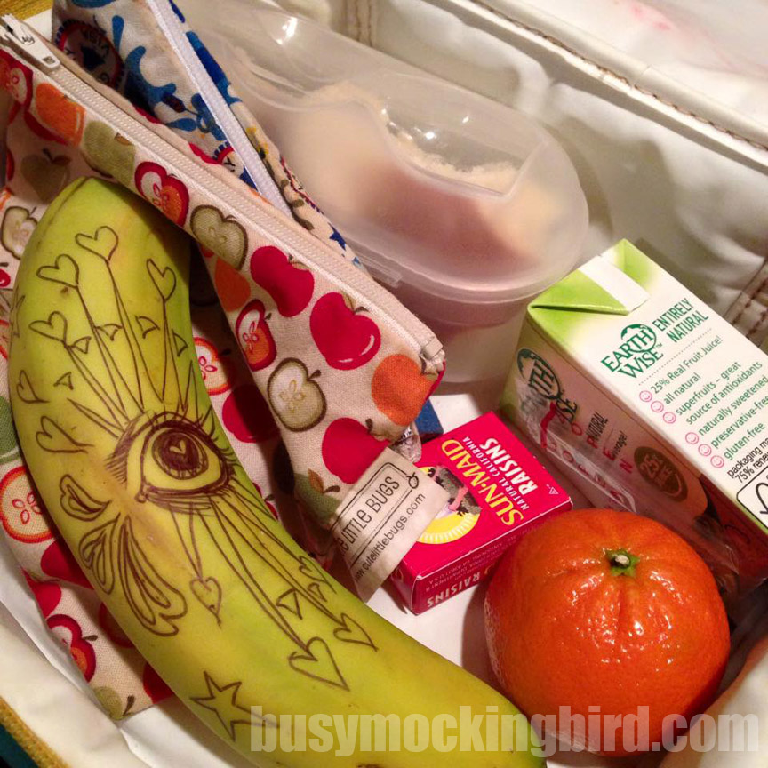 So a few things have changed…I didn’t like plastic baggies (’cause I’m about 73% hippie), so after awhile I got fabric bags, and just drew on a quarter of a paper towel. I used to love the notes my mom left in my lunches when I was a kid, so the idea was that since Myla can’t read yet, I wanted to leave a little something in her lunch to make her smile. She knows that hearts mean “love,” so I made sure to always include a heart on them. And since kids’ interests change SO quickly, I also tried to draw whatever she was into for the day, be it mermaids, Groot, Wonder Woman, or C3PO…