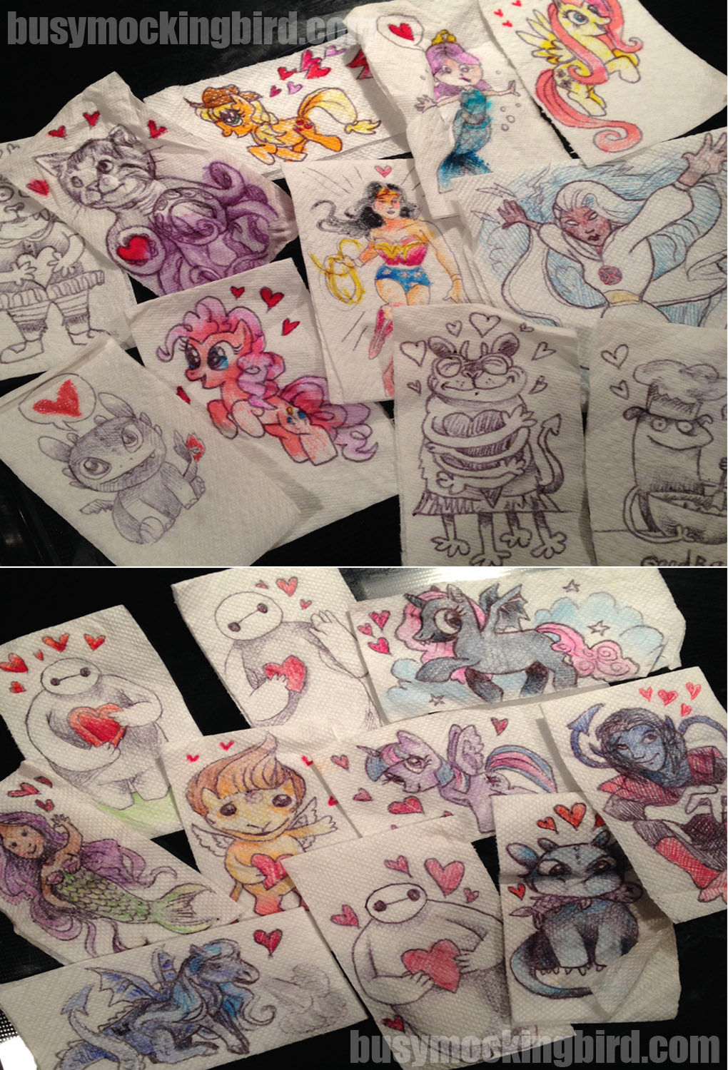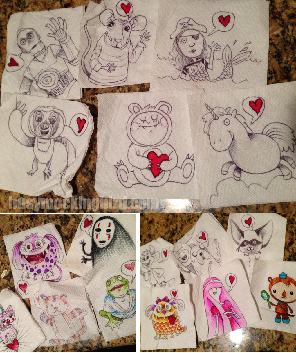 So now it’s become a daily thing. Every evening, I get her lunch ready, and sit down with a napkin for a quick doodle. It doesn’t take much time at all, really–especially for what you get in return (which is that you make your kid smile at lunchtime).