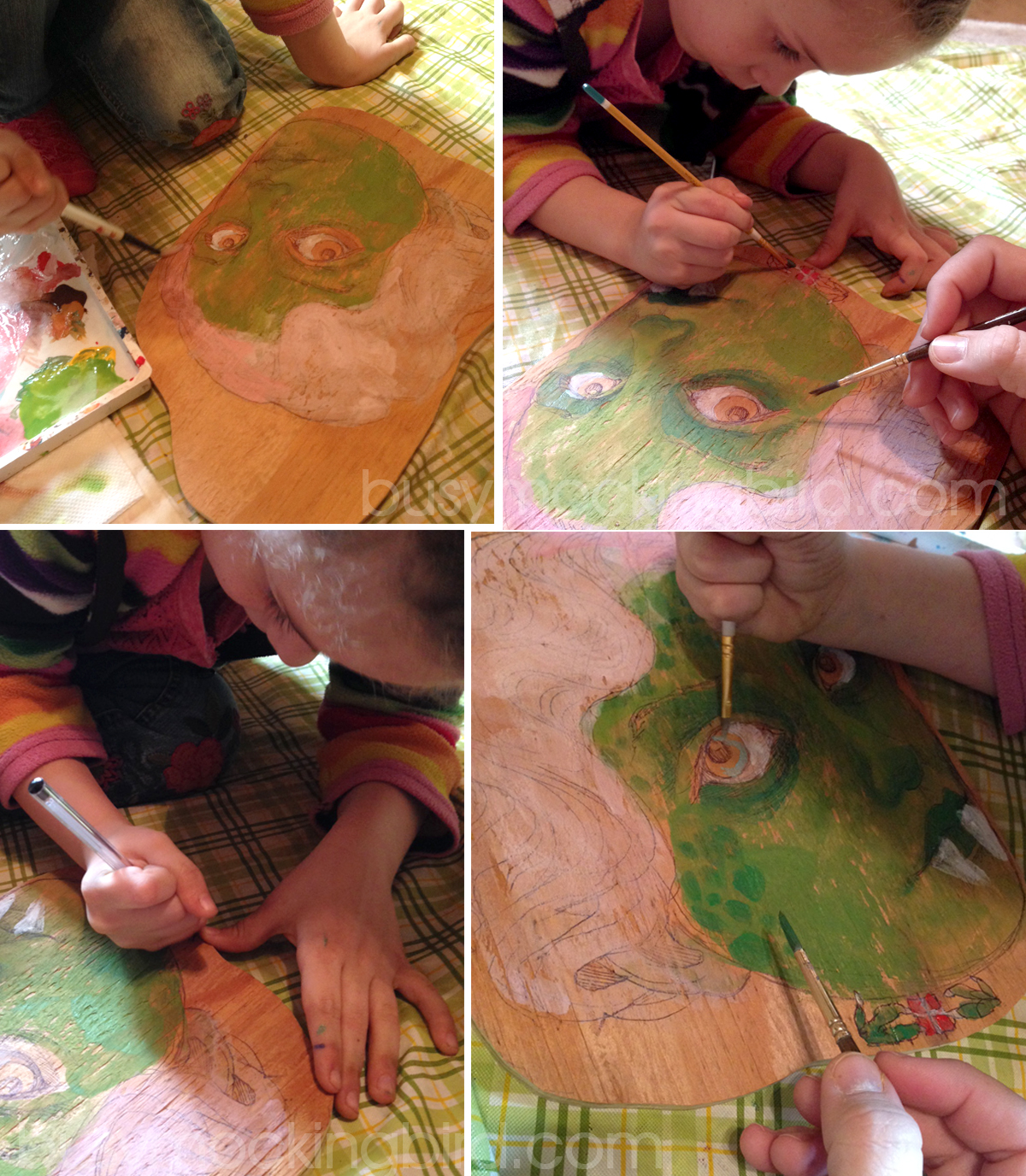 I didn’t want to alter it TOO much, but I also wanted to join in with her, since she asked me to. I made sure to ask her before I did anything. I let her give me direction. And watching me, she picked up that a quick way to make scaly dino skin without too much detail is to paint dots on the face in a darker color. She learned that a little darker or lighter makes shadows & highlights. She ASKED me about these things, not because I sat her down for a lesson…but just simply from observing a fellow artist.