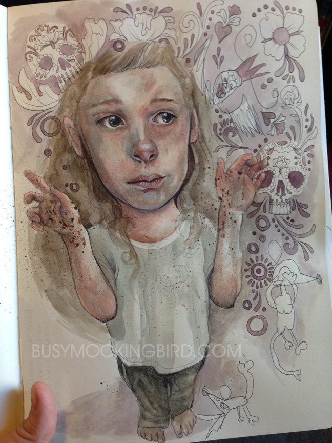 Weird, right?  Let me explain:  I’ve been struggling with another piece, one of Myla with her ghost-rats (she had two pet rats that died and she believes they’re running through the fields where we buried them, “playing with their ‘chothers.”).  I tried it a couple of different ways, and even got as far as starting to paint it: