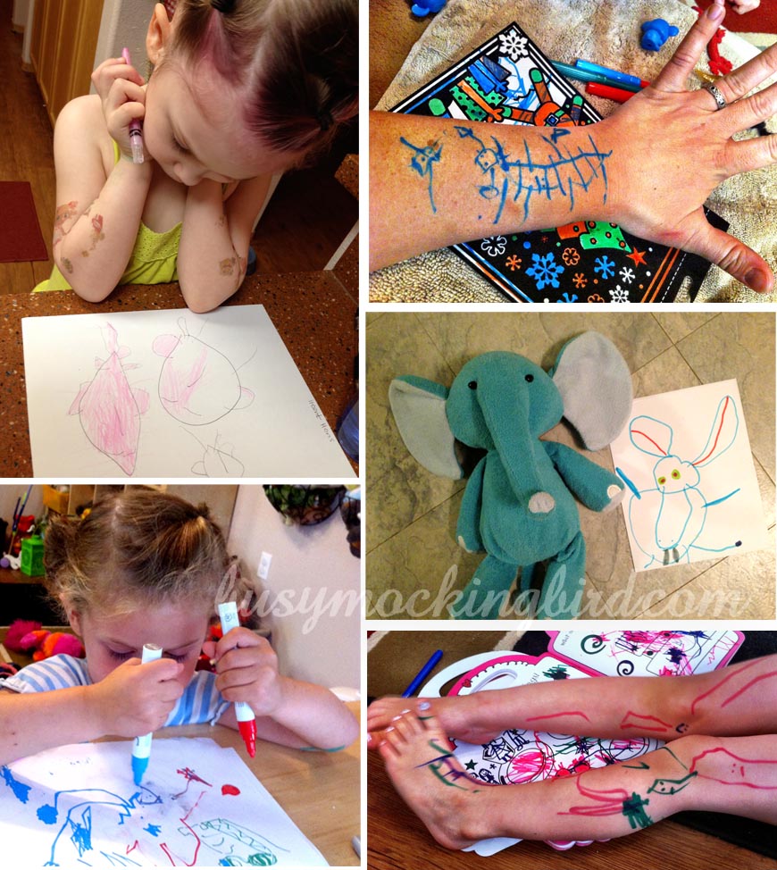 Myla wasn’t always interested in drawing.  We spent three LONG winters in Fairbanks Alaska, which is well below negative temperatures for 8 months out of the year.  My husband was deployed.  Myla (who had just turned two) and I spent a LOT of time indoors.  We had to find ways to entertain ourselves.  This usually involved tea parties with water, stacking up megablocks, baking soda & vinegar volcanoes, and trying not to climb the bookshelves.  Eventually, it turned into fingerpainting and drawing on ourselves.  It was hard, but it was fun.  By the time she was three, she began turning her little doodles into “monsters,” and was suddenly VERY into drawing (and has been ever since).