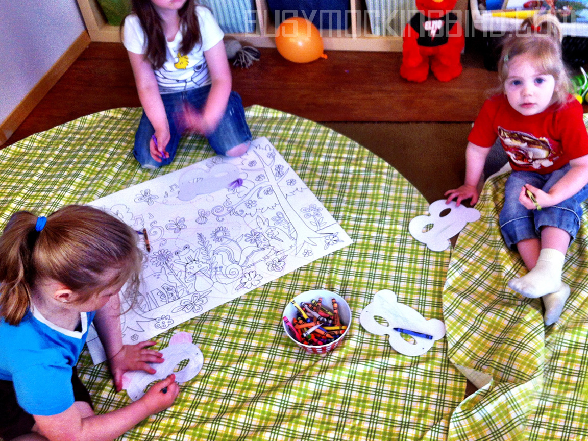 With kid parties, I find it works very well to have some sort of project or activity for the kids to do when they FIRST get there, so they’re not sitting around just waiting for everyone to arrive. (I try my best to make sure it’s as stress-free for parents (and therefore ME) by having things to safely keep the kids busy with.) I put some crayons in a bowl, some tablecloths on the floor, and let them doodle. I had a posterboard that I had doodled some animals on out as a coloring page as well.
