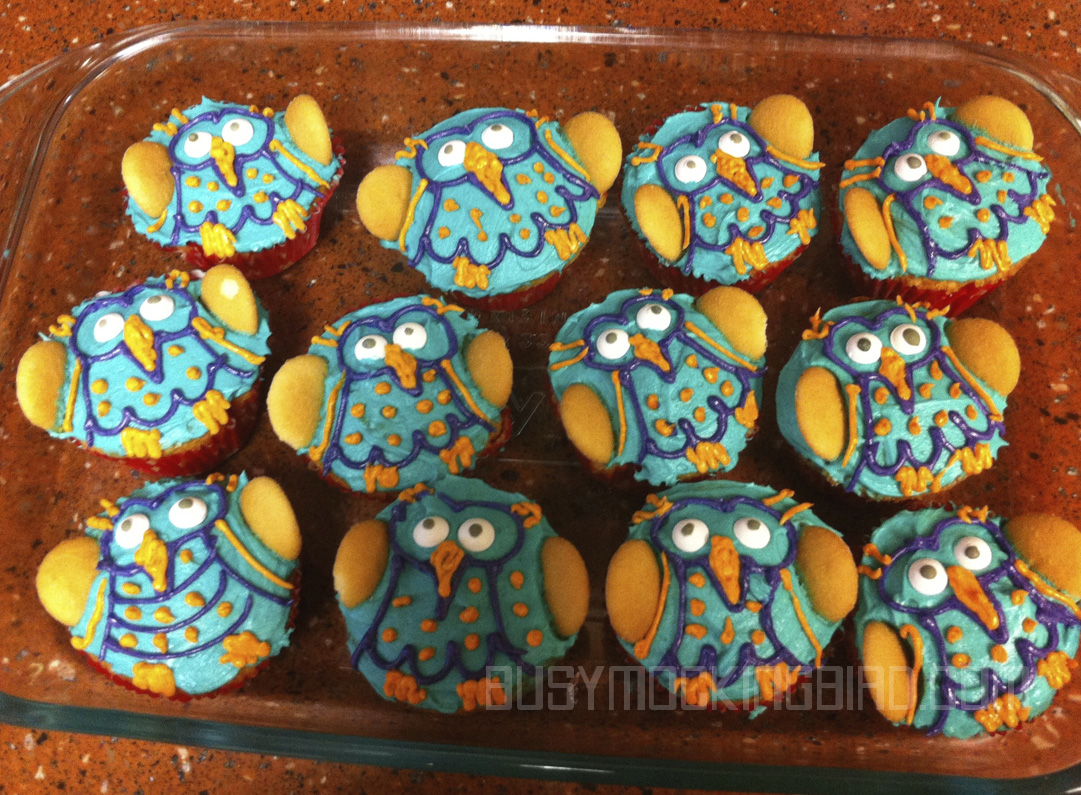 The internet is FULL of all kinds of owl cupcake ideas, so I sort of took them all and made my own version, with pre-made candy eyes, colored icing, and mini nilla wafer wings.