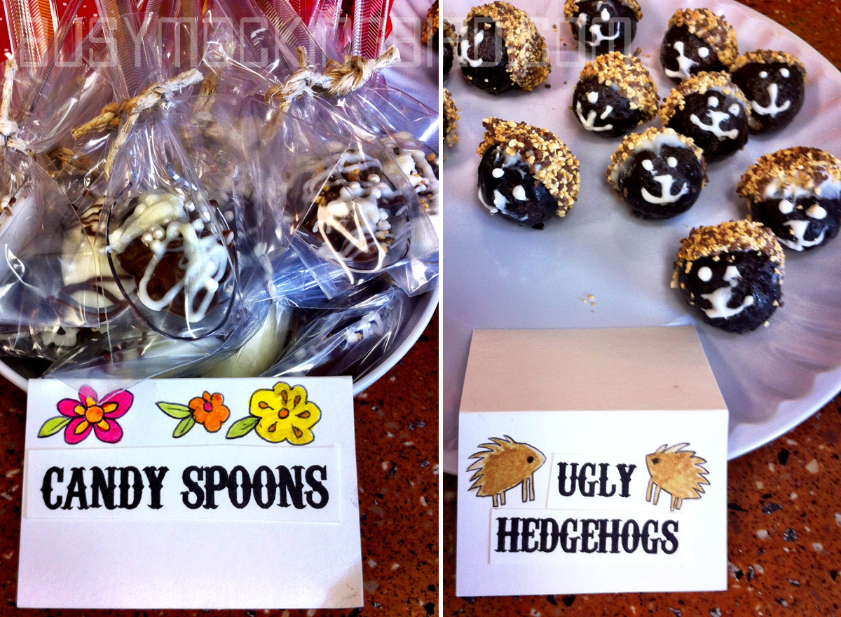 There were some that were NOT as successful. So in the spirit of sharing what DOESN’T work, let me show you my chocolate spoons, and my ugly hedgehogs…(because I couldn’t find regular donut holes and had to get chocolate ones, and it just turned out all kinds of wonky, and hardly anyone touched them, and I can’t blame them one bit.)