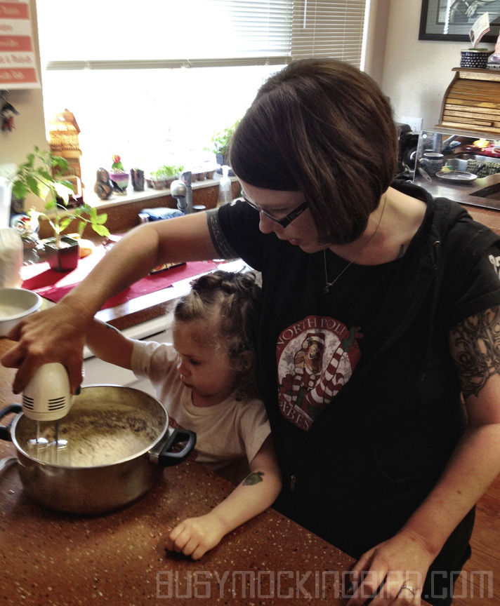 But my FAVORITE part of all is making the cake! The night before, I let Myla help me mix it…