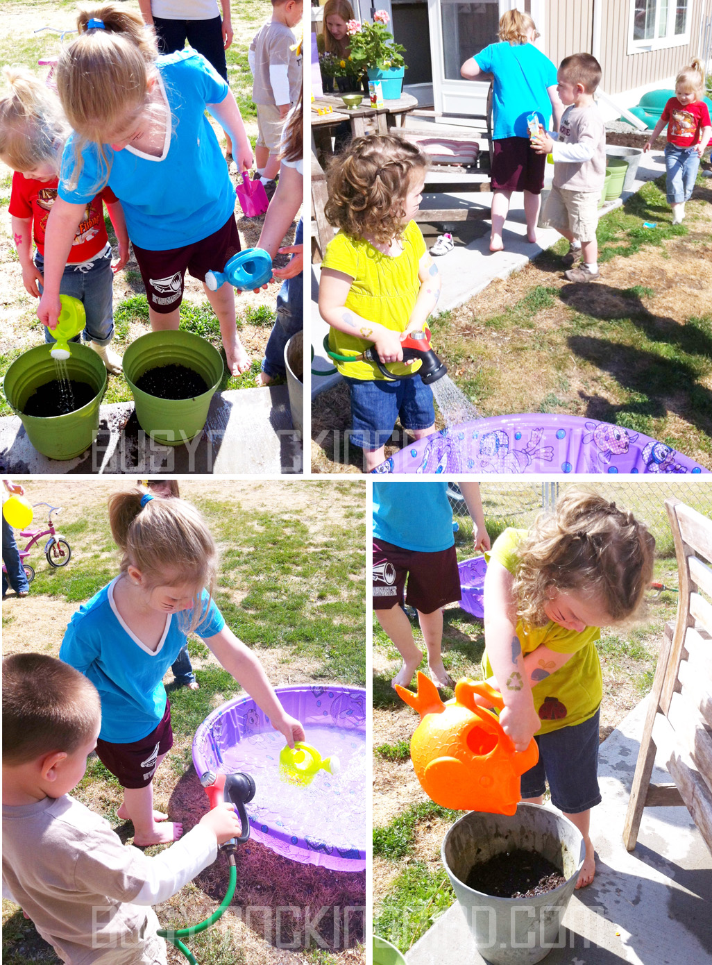 After we ate, we all went outside to let the kids get nice and dirty. I had the hose sprayer out for the kids to spray in the kiddie pool, and they all took the little dollar-store tools & buckets. I had gotten a few bigger plantholders and let them throw random seed packets down and water them. Honestly, it doesn’t matter if it grows, right? They had fun just getting dirty and pouring water.