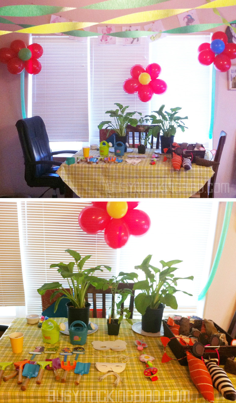 So, for Myla’s 3rd birthday, we decided to throw a garden party with our friends. But not a fancy tea party-type garden party…a messy, dirty GARDENING party! I made a point to tell everyone to wear some get-dirty clothes so the kids could have some fun. I found a tutorial online for really cool balloon flowers…