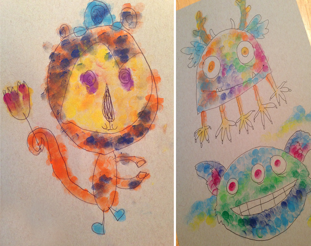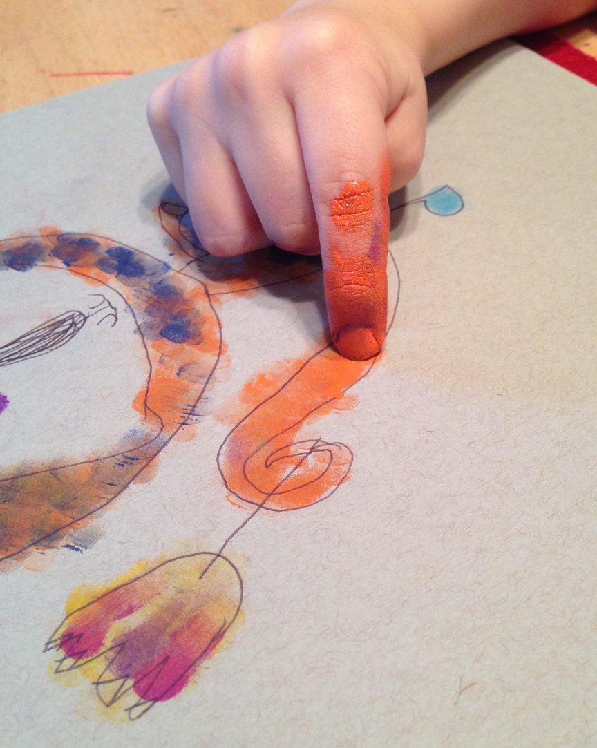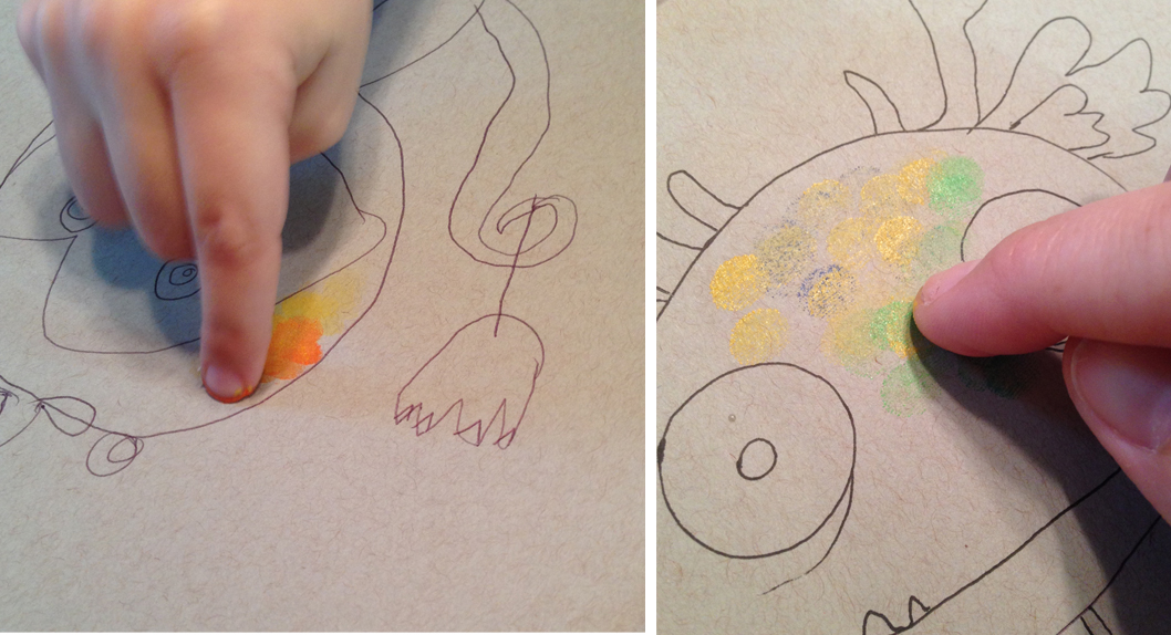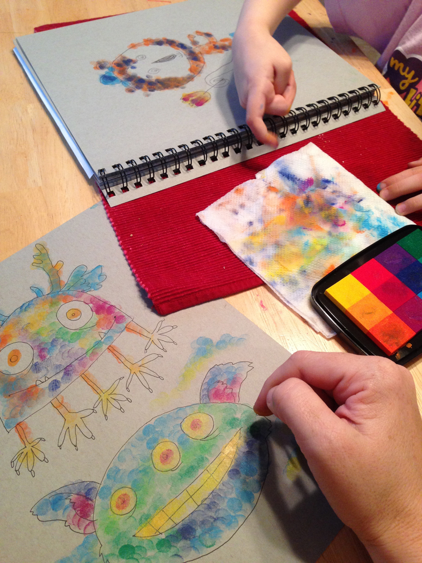 She played with different colors to sort of get a brown color going–oranges, reds, yellows and blues. And it was working! I, on the other hand, made rainbow monsters. But still, I was trying to demonstrate how the different colors blended when you looked at them from far away, without actually blending. An up side of using the ink pad stamper also, is that the colors DON’T run together, so you truly get a “point” of color. She noticed how from faraway, her drawing looked sort of brown, but closeup he was made up of lots of little fingerprints of different colors.