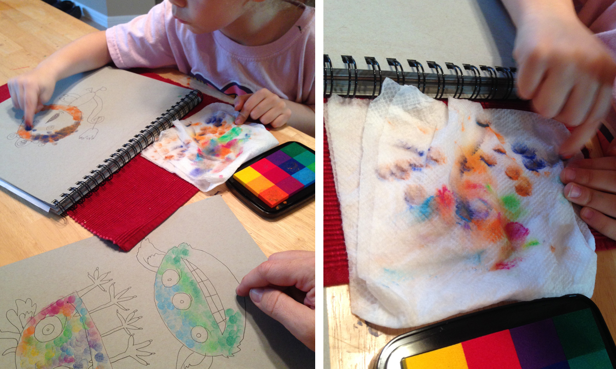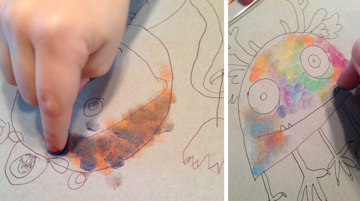 We had fun just blending the colors. It was calming. It was relaxing. The soft little pat-pat-pat sounds of our fingers on the paper was quite comforting.