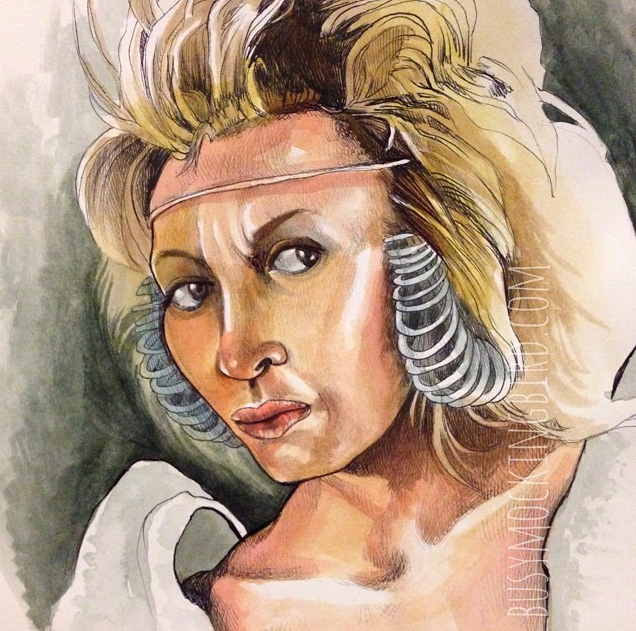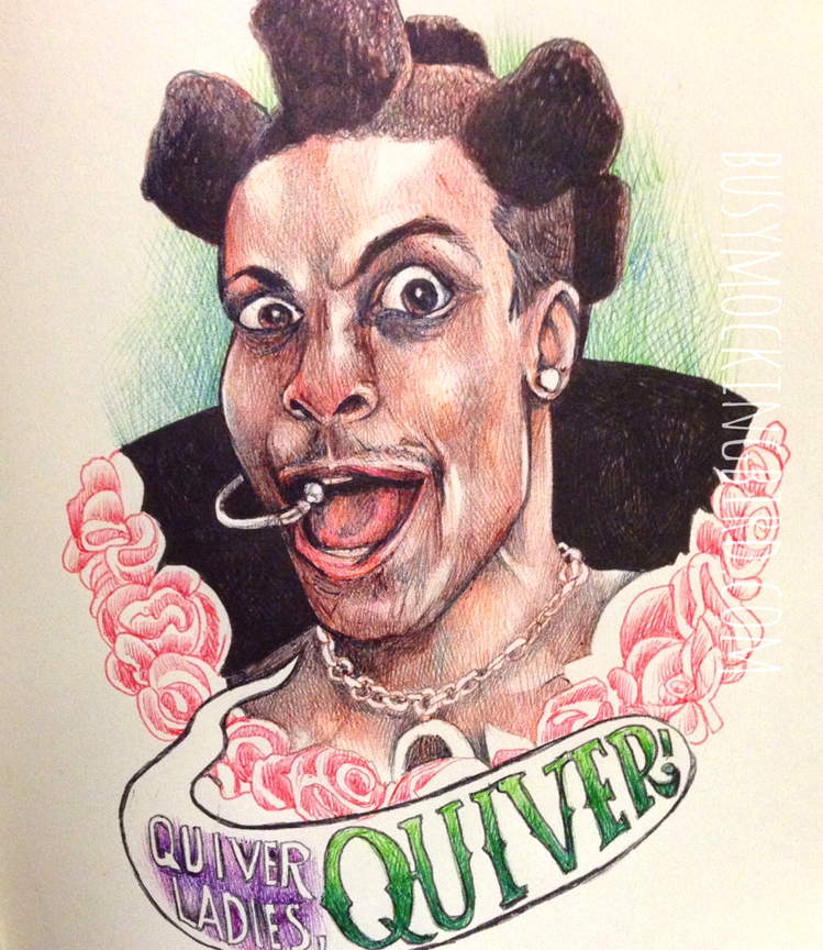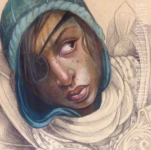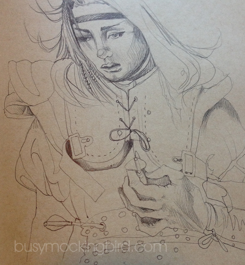 Funny thing about ballpoints, though, is that they glurp. Those blobs of ink on her face and in the background? Those are glurps. I don’t mind them all THAT much, but they’re a little tough to work around sometimes (I don’t even know HOW those other guys keep the glurps away). To avoid the glurp as best I can, I am constantly wiping the ballpoint pen (which I SHOULD do on a napkin, but I don’t, so if you were to look very closely, most of my clothes contain a cluster of small dots, usually on my right shoulder or pants, from twisting the glurp off of the pen before drawing). Still, glurps happen…and that’s okay. They’ve kind of grown on me, even. Gives them a bit of gritty character.