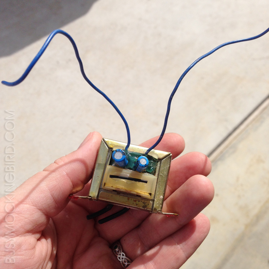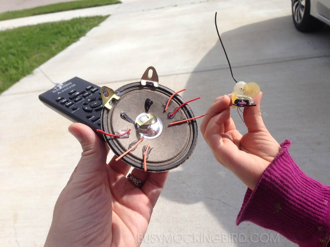 I offered that as a suggestion, and Myla jumped at it. We dug around the garage for some old electronics, but since I had recently donated or dumped most of them, a trip to the thrift store yielded a good harvest: $5 for an old broken cassette player and a video tape rewinder. The height of technology at the time, they now served a much more artistic purpose by yielding parts for our creations.