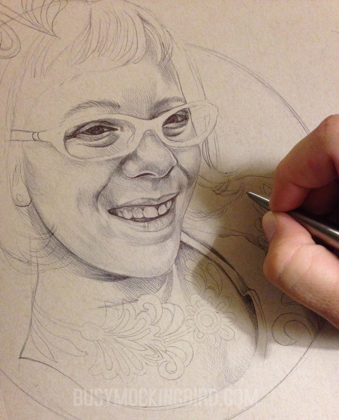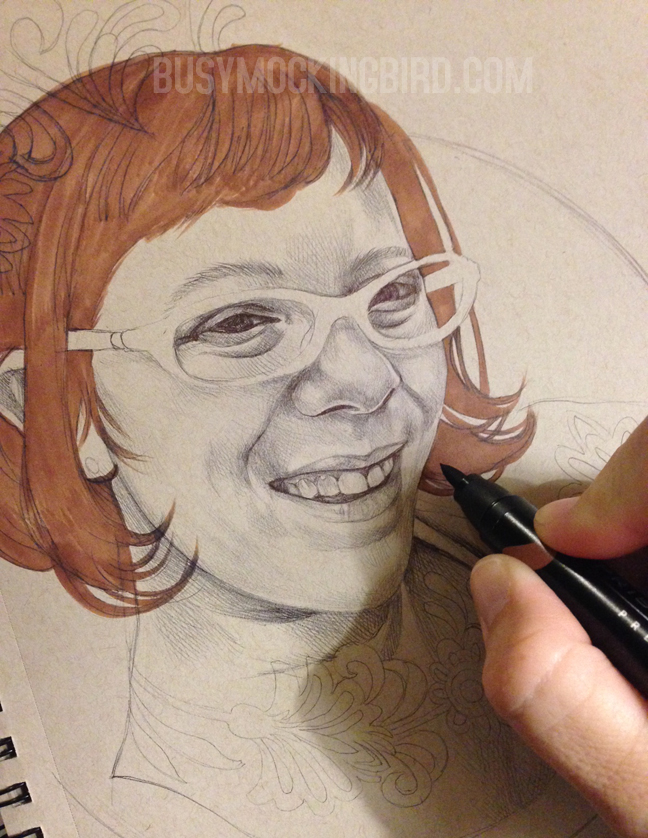 So, with a photo for reference, I sketched. I always sketch in ballpoint pen (I may have mentioned that I love ballpoints). I used a photo I took from when I visited her right after she had her daughter Lila. I am aware that a better likeness might be obtained from gridding or tracing of the main shapes, but for the most part, I like the personality that jumps in there when I don’t try to go for 100% realism…