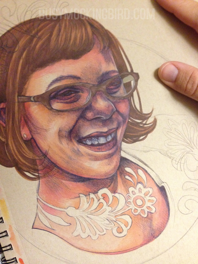 Here’s the funny part about Prismacolor markers…..they are SO good at blending…but they sometimes react in a funky way to ballpoint pen. This process used to terrify me, but I am used to it. I use this process with the collaborations I do with our daughter…I just had not yet gotten comfortable with it on a portrait of a beloved friend. GAH! She’s PURPLE!! –Calm down. Don’t worry. The ink soaks into the page, and if you push through it, it spreads, and you can blend it all in fairly well. Those of you thinking “why not just skip the ballpoint?” you have a valid point, but I just can’t because: BALLPOINT.