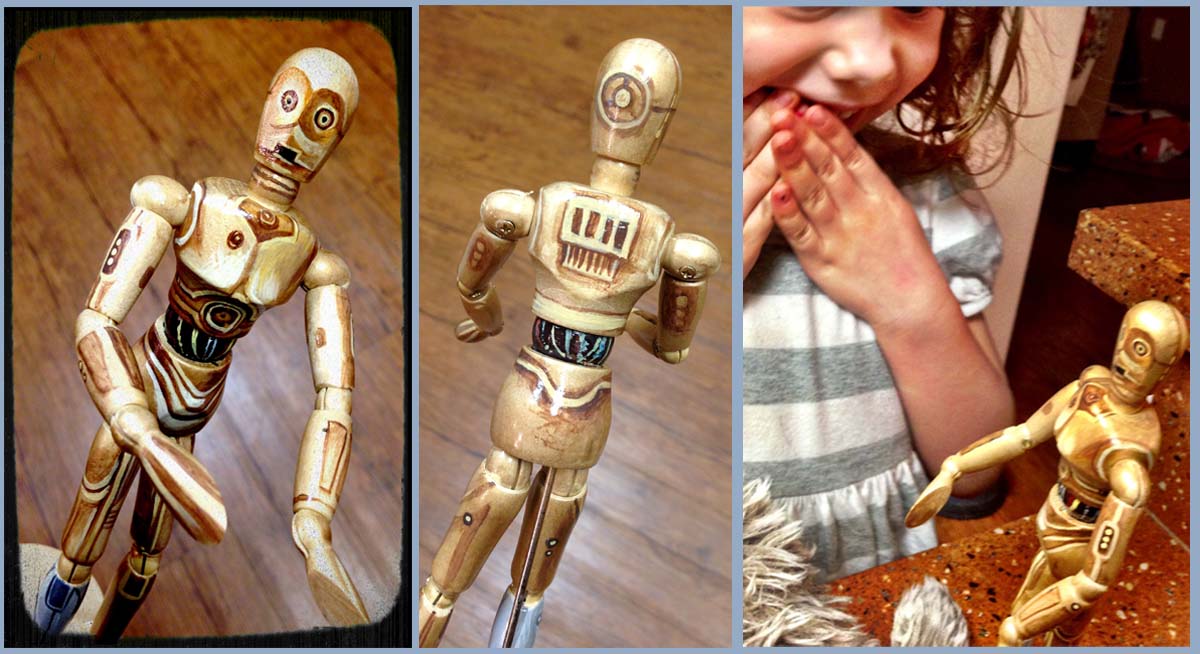 Funnily enough, C3PO was my favorite as a kid, too. (When had I painted our Munny family portraits well before her discovery, you may notice I was C-3PO.) Yes, R2 was funny and silly and snarky, but you wouldn’t really know what his beeps & whistles meant without the other half of the conversation. 3PO was silly and personable and charming. And our daughter developed a “crush” of sorts on him. All you’d need to do is say “Oh deah!” in that dainty little accent, and she’d giggle tremendously, as if she had just been spoken to by a movie star. This meant that she would often ask ME to pretend to be C3PO, which I didn’t usually mind doing (even in the grocery store).