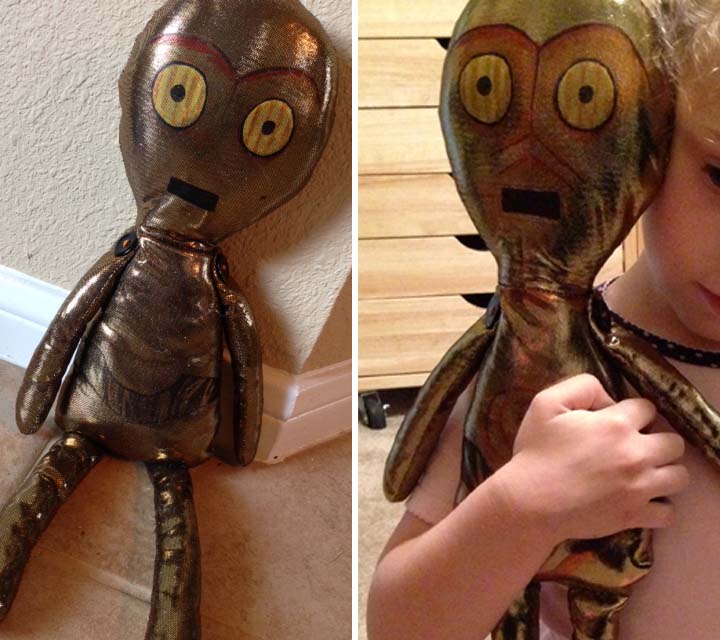 I made her (by request) what turned out to be one of the (unintentionally) creepiest dolls I’ve made. (C-3PO doesn’t work well as a soft doll, we found out. But she liked him anyway.)