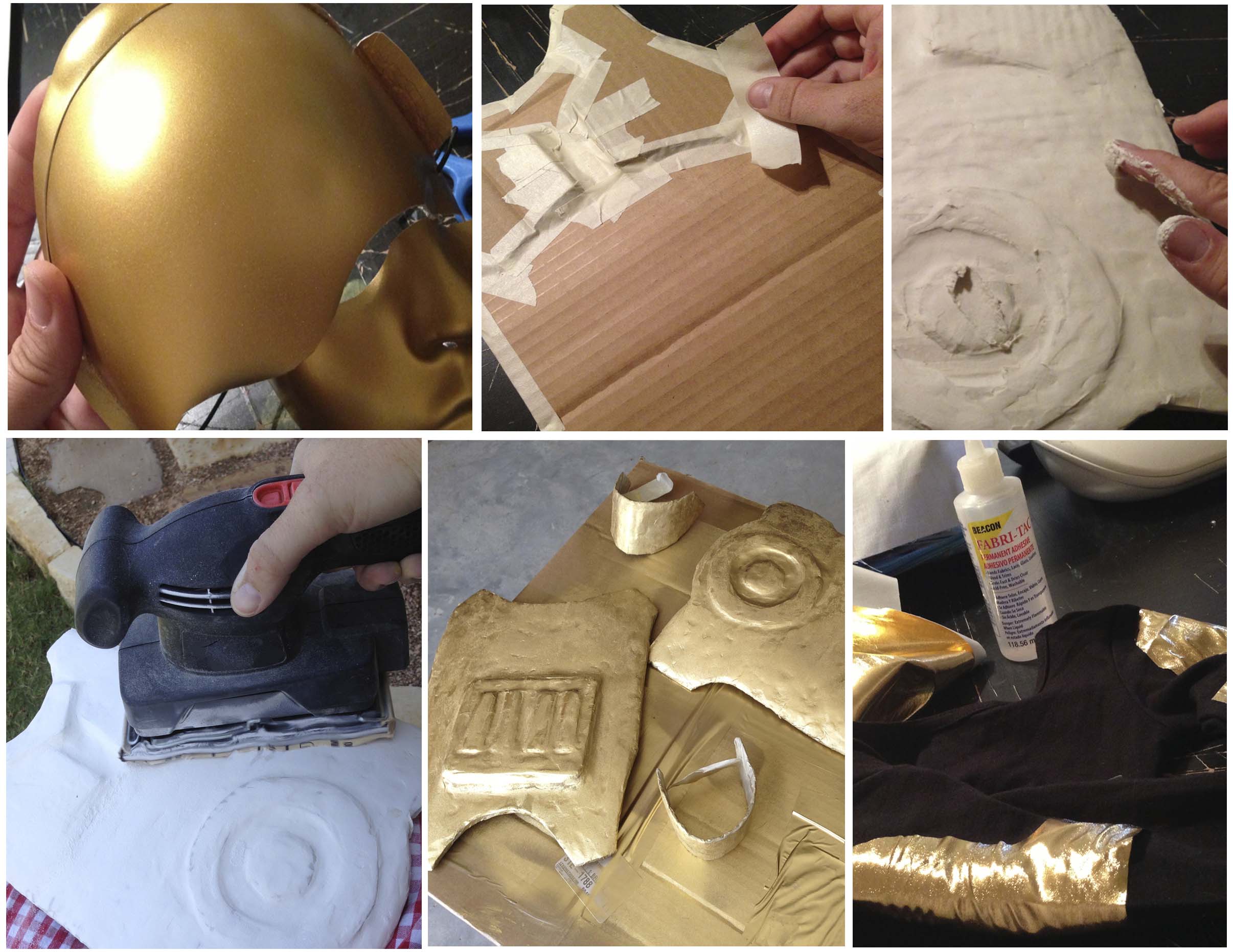 Since I didn’t want her face to be covered completely, I cut up a gold plastic craft store mask. I had seen all these awesome online tutorials about how to build your own cardboard armor, so I built up a chestplate and back with cardboard, masking tape, and paperclay (which is super fun stuff). When it dried, I sanded it and painted it gold. I got a black bodysuit, and used fabric glue to tack on little pieces of gold “plating” to the arms.