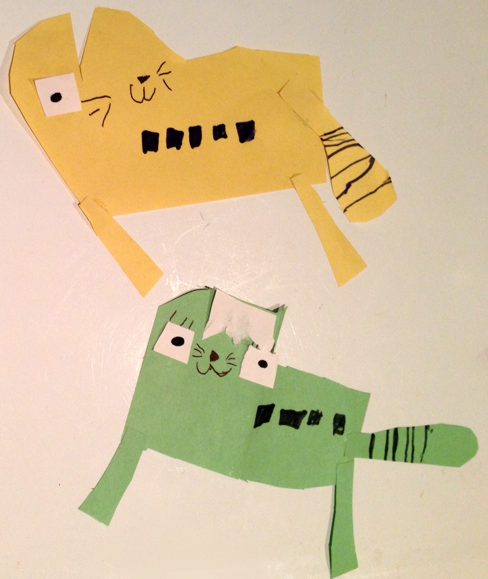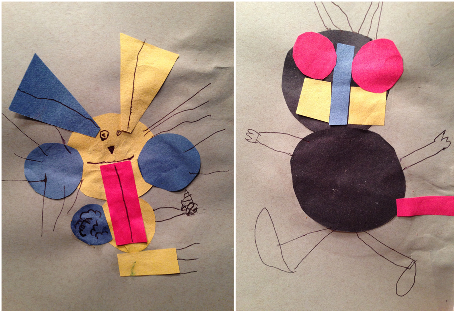 Here, she frantically cuts up tiny pieces of paper and usually tapes (because she’s got no time to wait for glue) or glues them together to make some sort of creature.