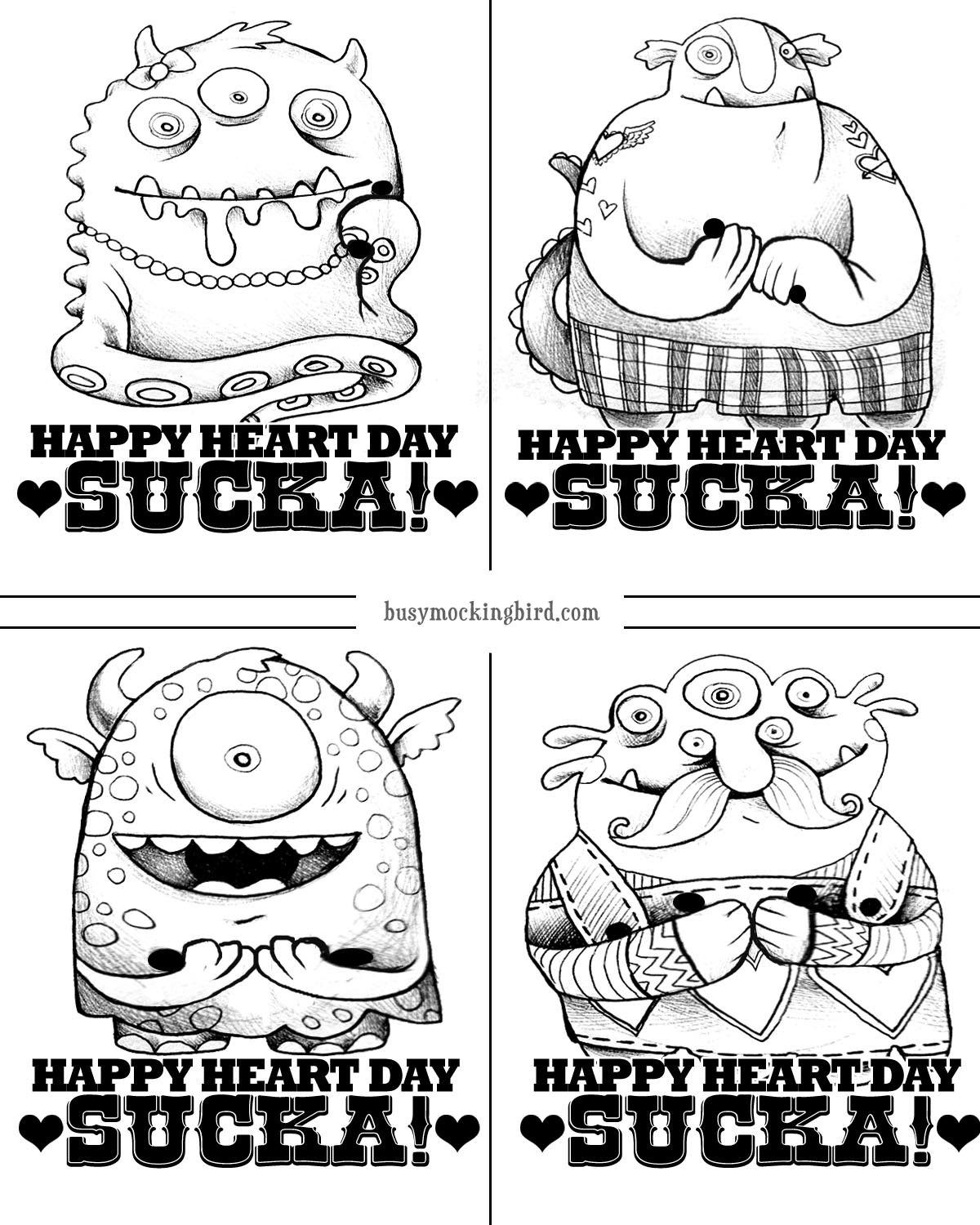 So if you’re a humbug about Valentine’s Day (or even if you’re not), feel free to print my sucka sheets out for yourself. Or get some from an artist like Stowe. Or come up with your OWN! I may not like Valentine’s day, but I’d LOVE to see what you do!
