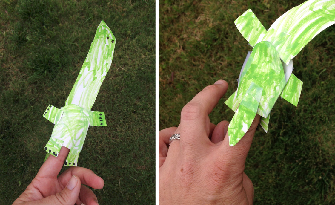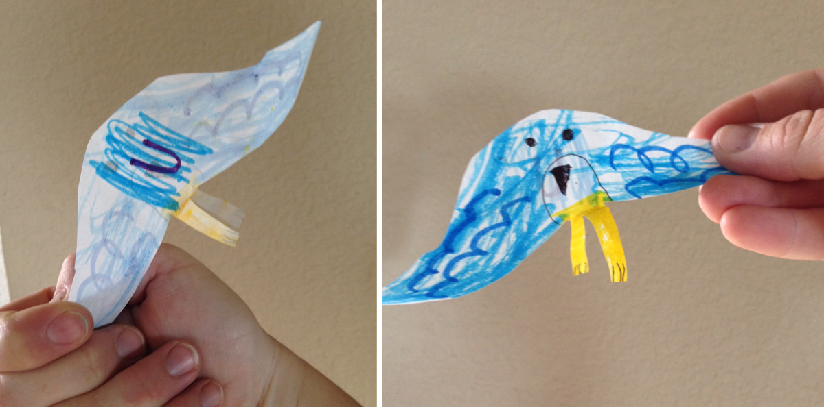 “They’re both beautiful,” I said. We talked about how when you have a great idea, it’s great to want to get it out as quickly as possible, but that sometimes when you take your time and plan it out, you have a chance to make it better, make it stronger, make it more like what you had in mind, maybe do things you hadn’t thought of before, or do them in different ways. When you rush, you might get the idea out quickly, but planning it out helps you figure things out that you might not have done with the rushed version. Since we took time to plan out the second kiwi, we made its wings flap down, so they could lay down to his side (instead of stick out to the sides) and we were able to make his beak stick straight out, like a kiwi’s.