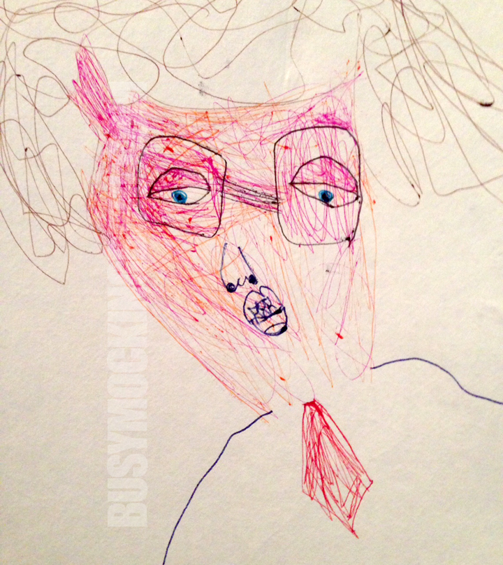 But the other day, I wasn’t feeling well, and I lay on my stomach on the couch with my sketchbook, and she dragged her marker box, scissors and tape into the room and started making paper bats like a madwoman. And then she suddenly looked up, climbed onto the pillows over my head, and stared at my sketchbook, watching me draw. I was playing with colored ballpoint pens, drawing Napoleon Dynamite.