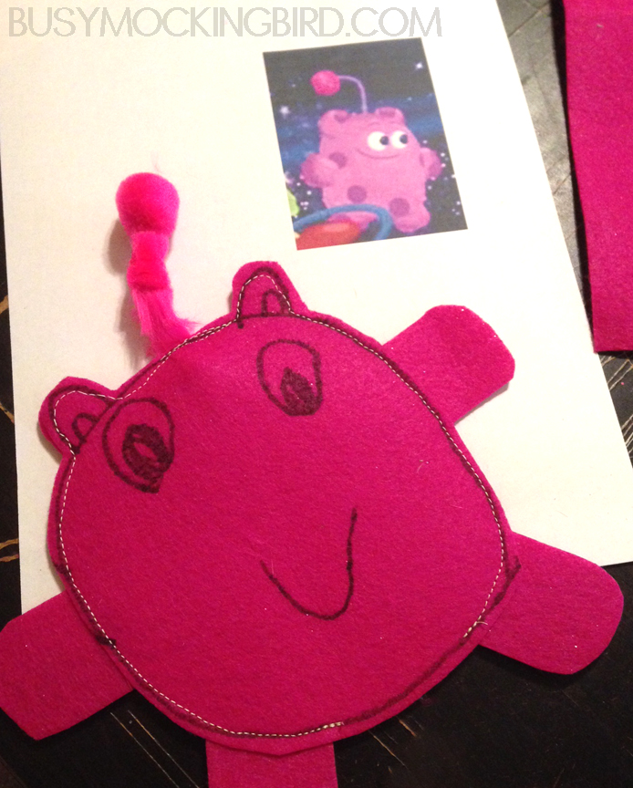 Epiphany is Arty the alien’s little sidekick. We’re not sure what he…or she…really is, exactly, but Myla thinks he’s cute. She started by drawing the shape onto a piece of felt. Since she wanted it to be stuffed, I showed her that she had to have a front and a back piece. Then she cut little arms & legs out. I had her help me sew a simple stitch around it on the sewing machine (I often have her put her hand on it to help guide it), and then came her favorite part: the stuffing!