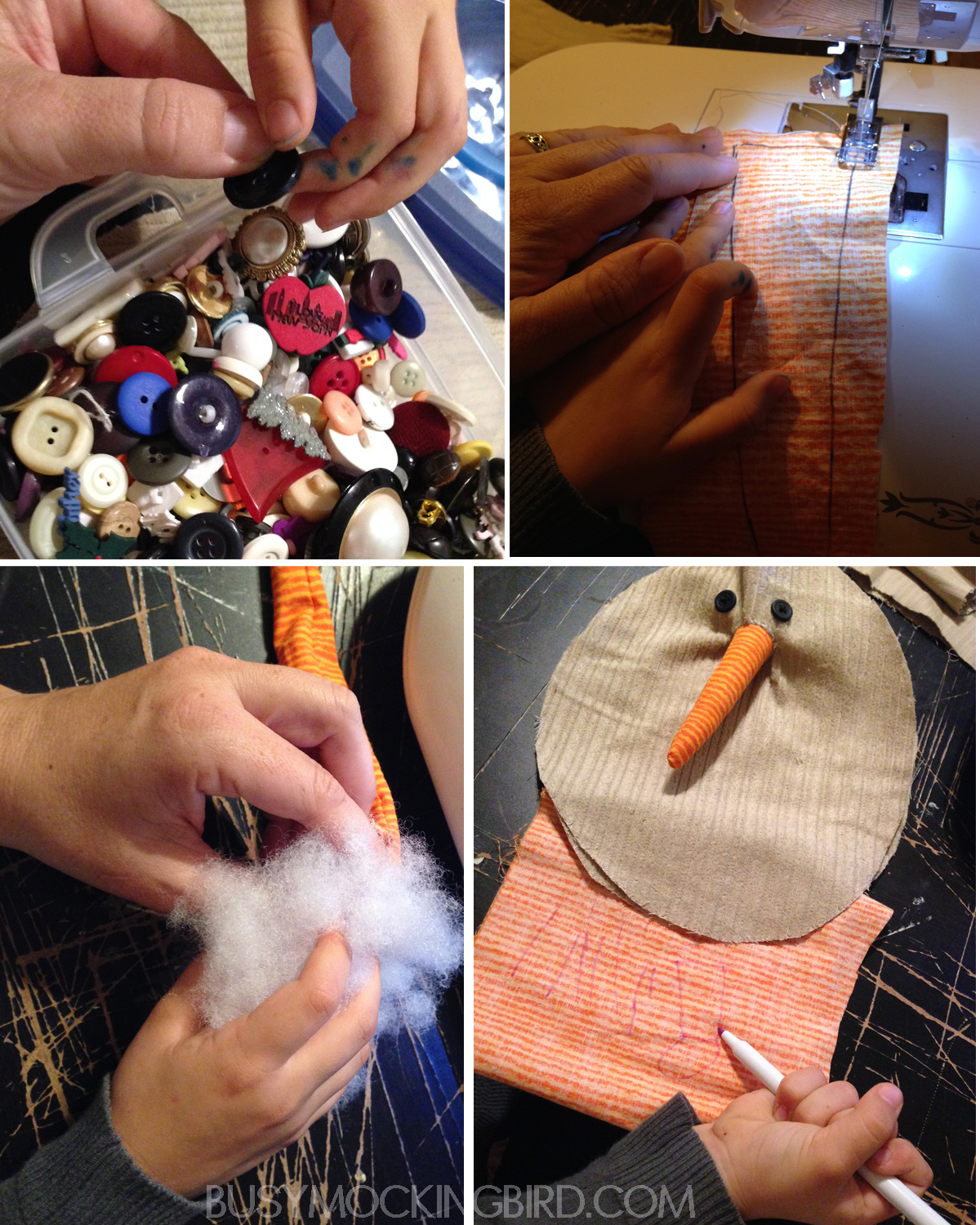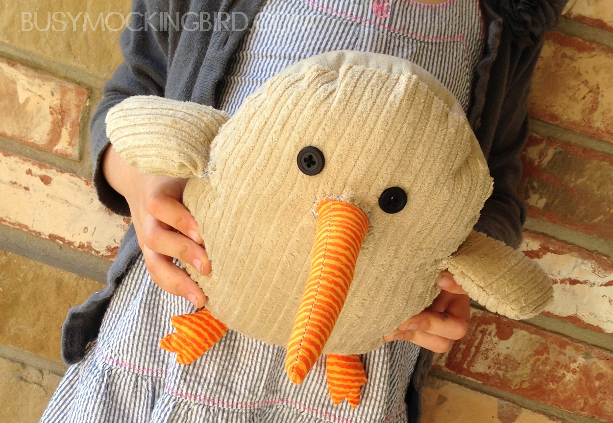 We drew pictures. We picked out button eyes. We talked about his beak and his wings. We chose which fabrics to use from my fabric stash. She helped me sew him. She helped me stuff him. She drew out what kind of legs she imagined he’d have.