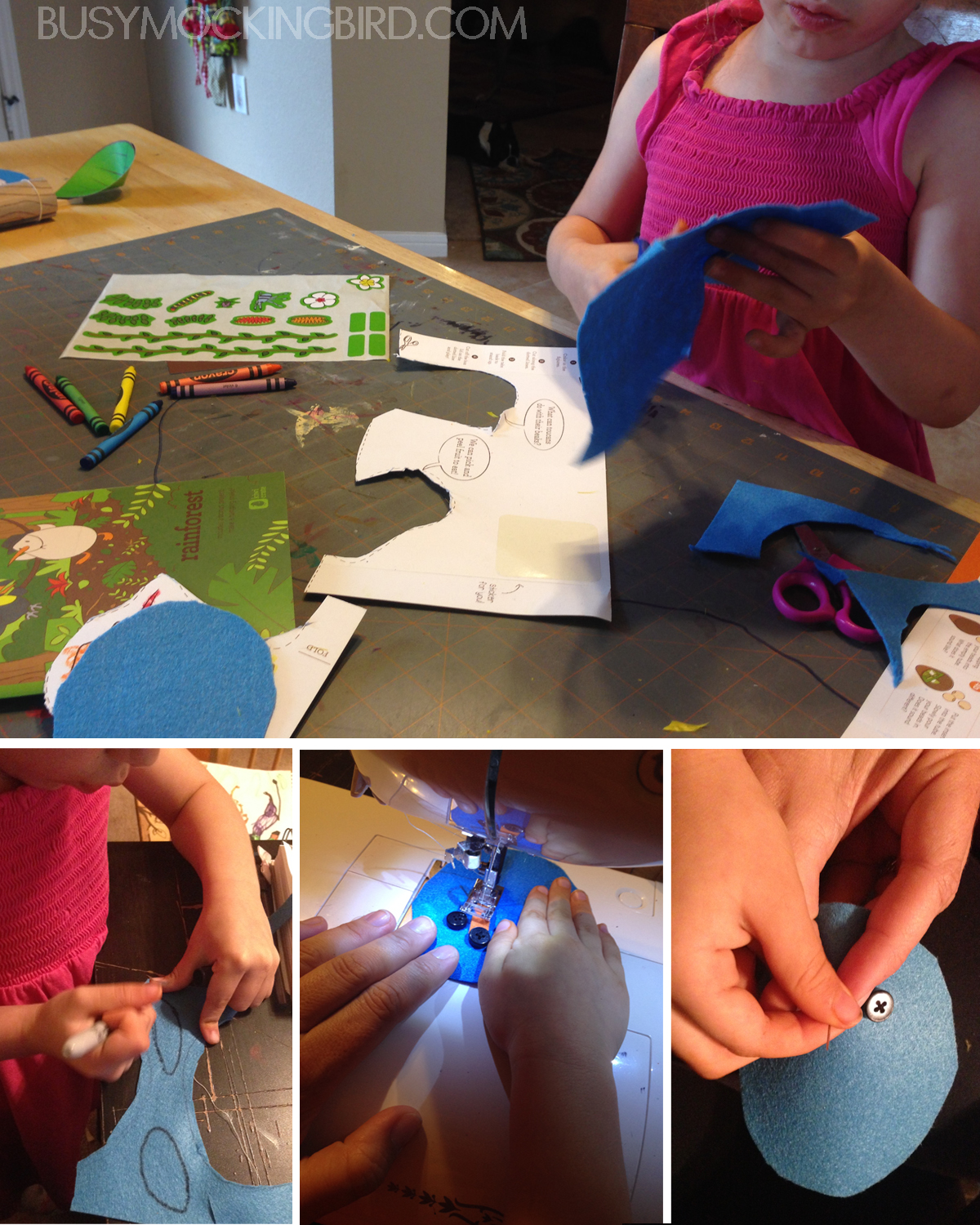 Carefully and meticulously, she cut shapes out of the felt that came with one of the monthly project kits, along with a few extra supplies from my sewing box. She quickly and furiously drew the shapes out herself, cut them out herself. It was HER vision, and she was so EXCITED.