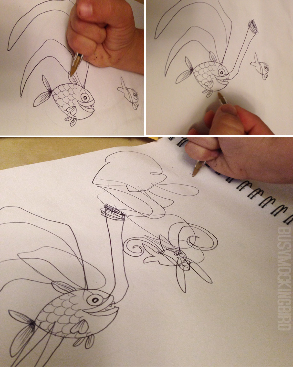 “Let’s both each draw a picture that’s a fish,” Myla said one day. We each drew our own on the same page, and, as will often happen, she inevitably became more interested in what was going on on MY side.