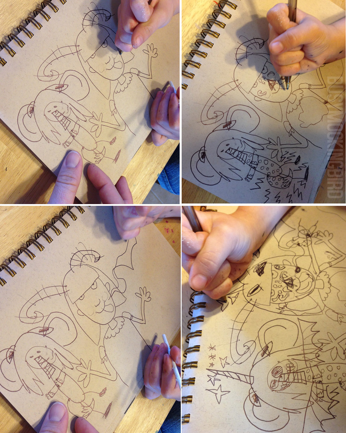 I always love what comes of them, as crazy as they are. I’m wondering what a finer version of it might look like. maybe it’d be different than our usual collaborations. It might involve taking some time and patience, which is very difficult for a 5-year old. People have often tried to “tell” us what we should draw together, and while people sometimes have some great ideas, it sort of just has to happen. In my world, the things that I push the hardest on are the things that don’t ever feel as genuine, and therefore aren’t as enjoyable for the viewer or the ones creating it.