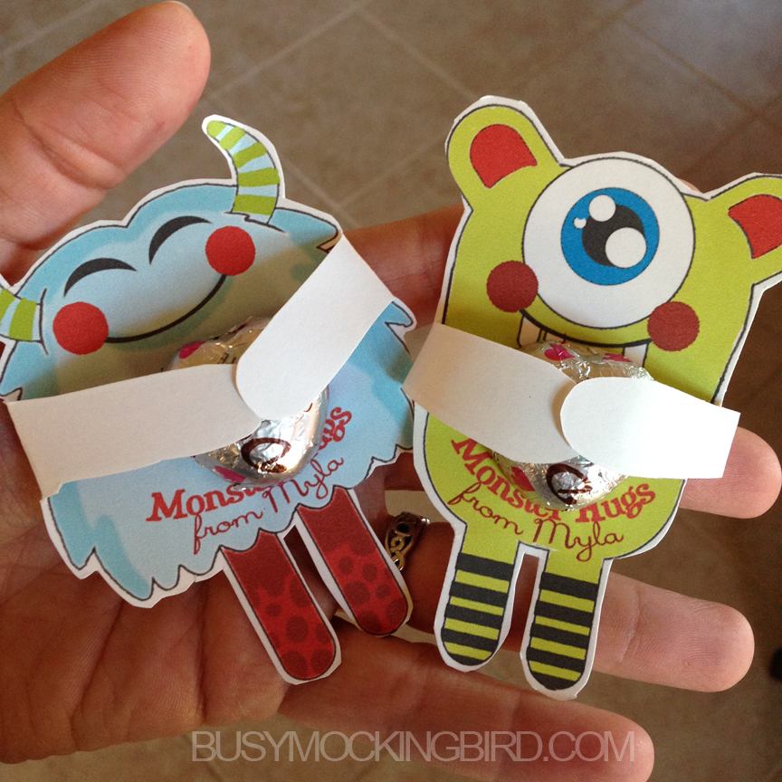 A few glue dots and some Dove heart candies later, and they were all done! I’ll even pass along my monster template, and you can feel free to customize it, if you like! Just right click it and save it to your desktop. Stick a glue dot on the belly, press the heart candy down, stick a glue dot on top, and fold the hands over…And BOOM! Sort-of instant valentines.