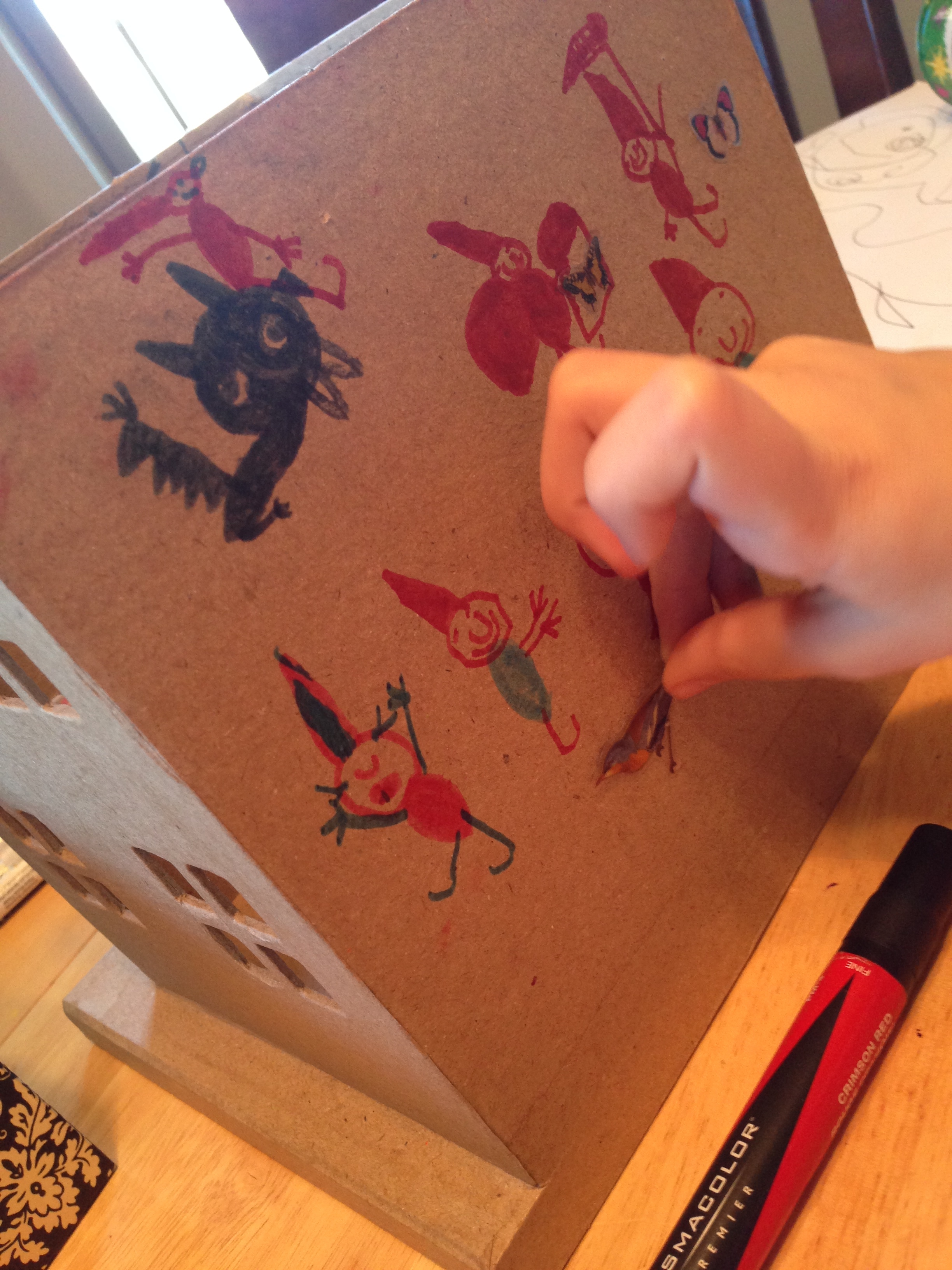 It was a fun little project, and we got all our supplies on a quick visit to the craft store. She was excited picking out stickers and decorative things to go along with it. I went the easy route and started with those pre-made papier-mache houses you find at the craft store for $5. While she happily decorated it with markered gnomes, I hot-glued sticks and fake plants to the roof.