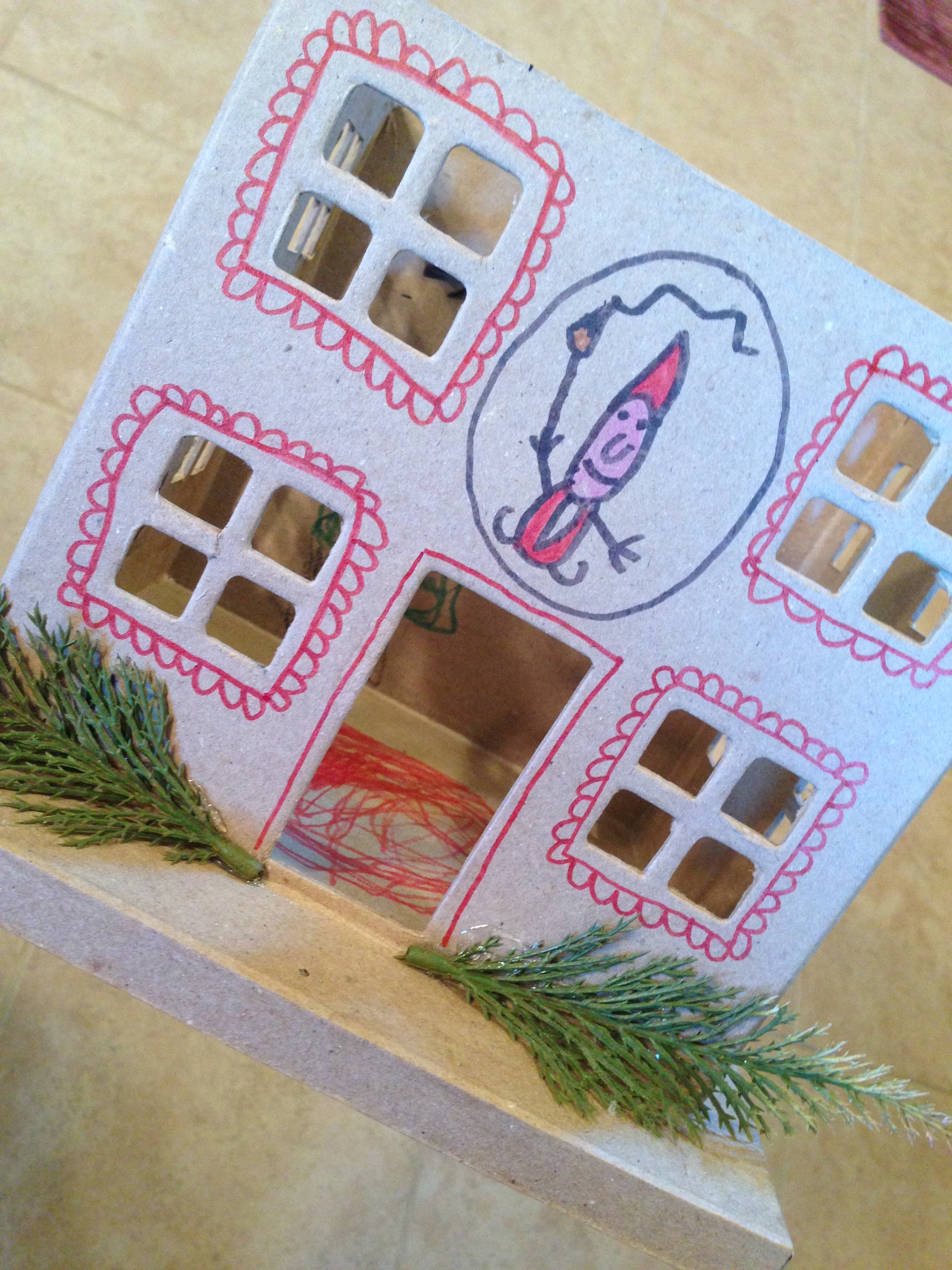She drew all over the outside, and filled the inside with a doodled Christmas tree (probably influenced by the fact that ours is still up. Don’t judge.) and other stickers & doodles. And the front door was headed by a cute little “painting gnome.”