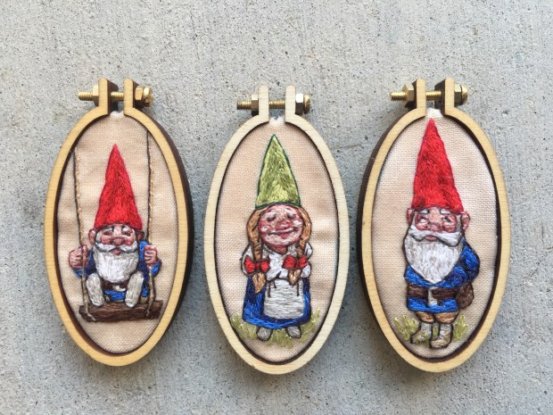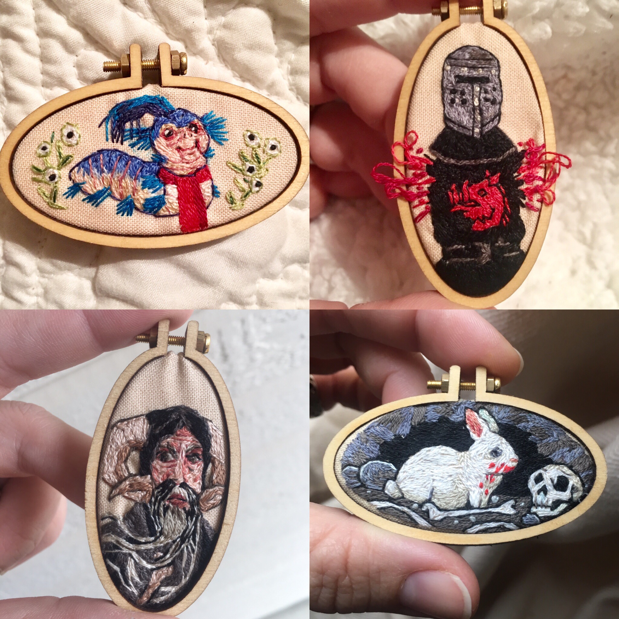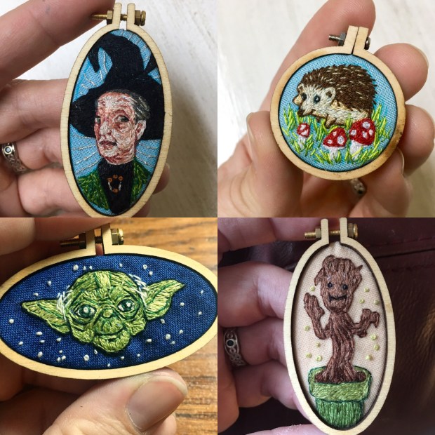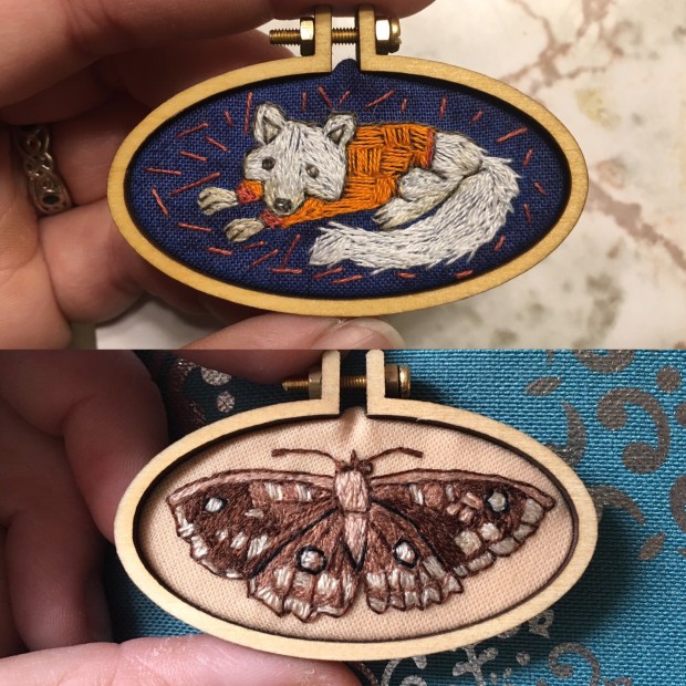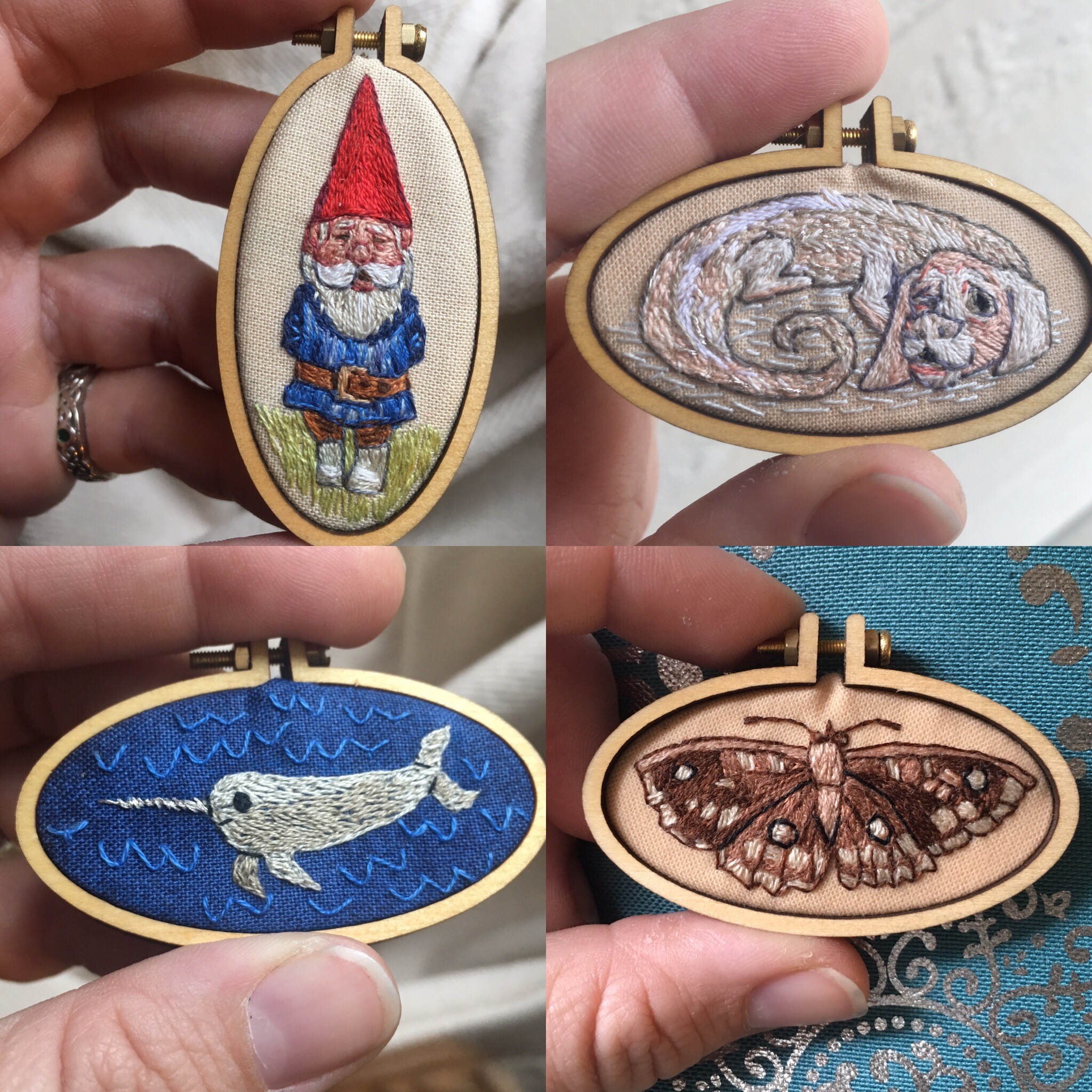 Although I didn’t have very many of the nice tiny hoops to frame them in (as they were ordered from Dandelyne online), and although I hoard them greedily for myself, I went ahead and sacrificed a couple for her to use.