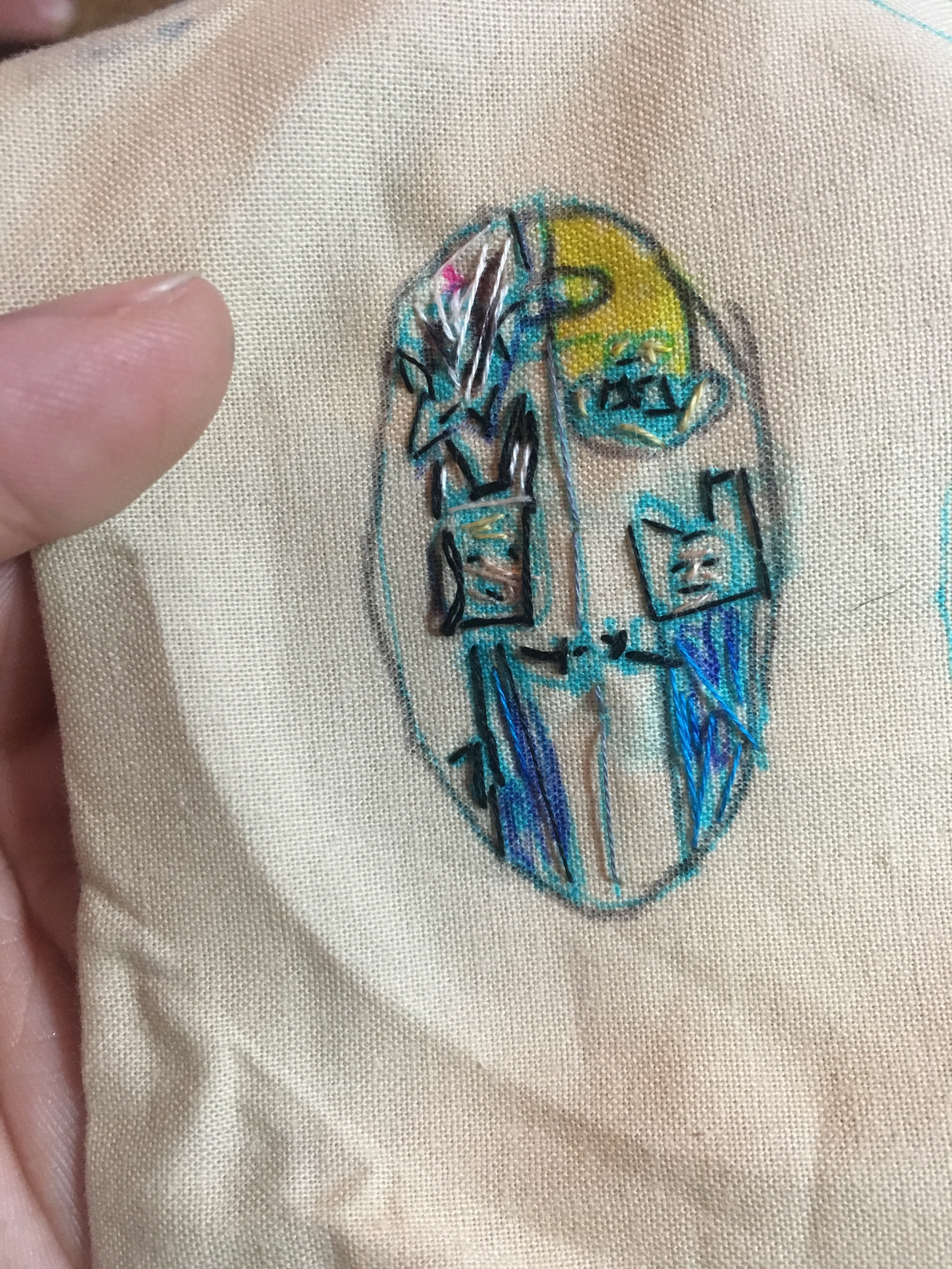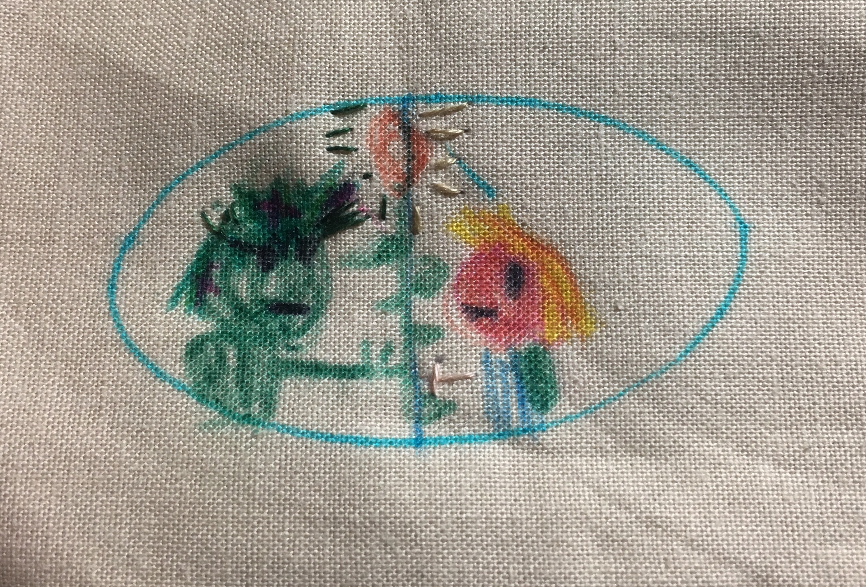 I started by letting her sketch something small with pens (a tiny drawing of Finn and Jake and Fiona and Cake from Adventure Time), and then she added some stitching to embellish it.