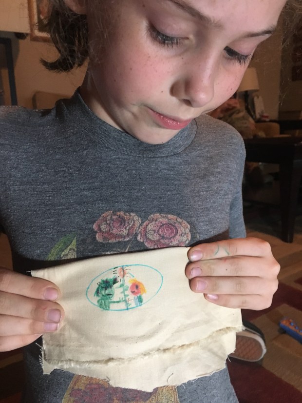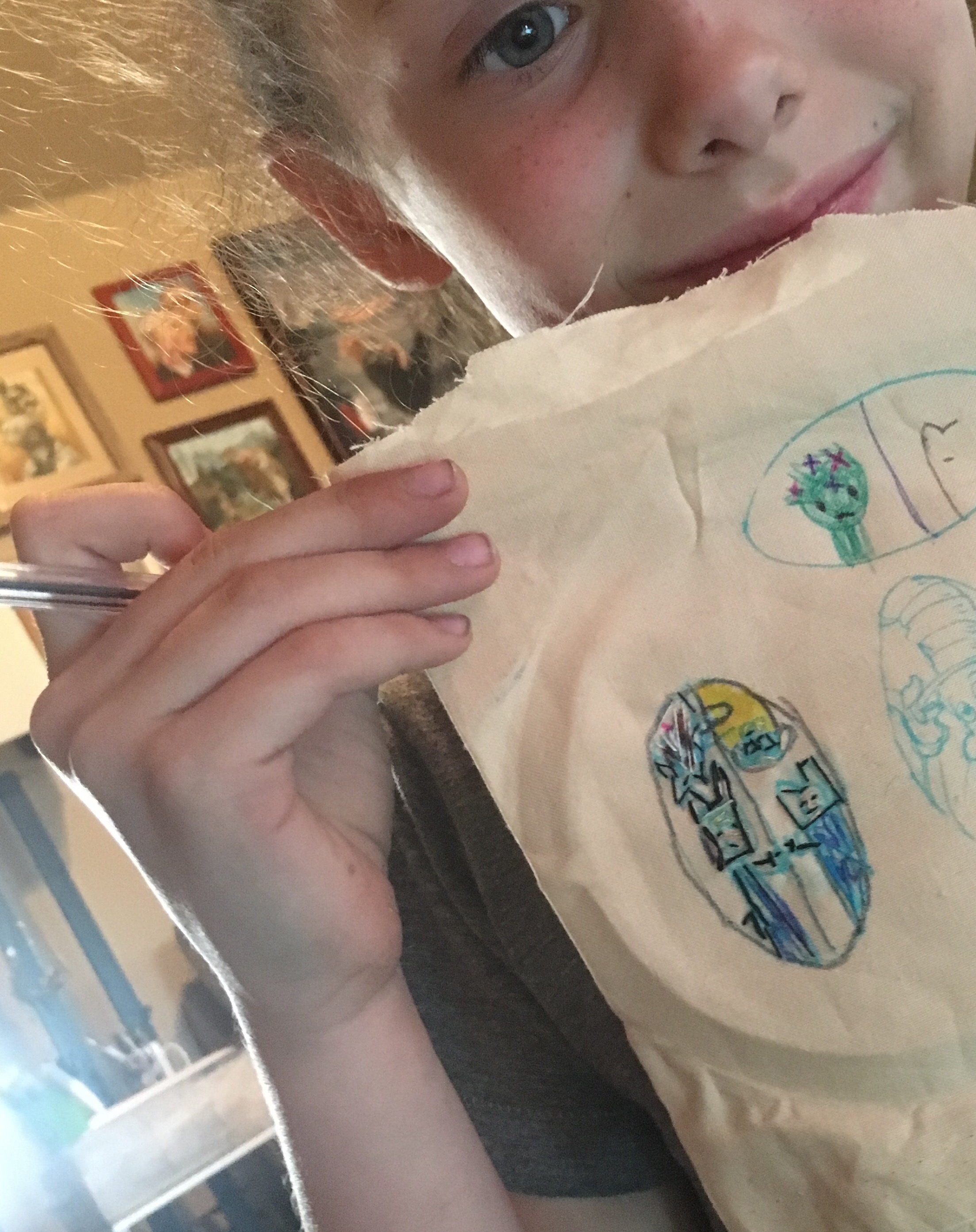 I grabbed our bag of permanent markers, and told her she could draw away, keeping in mind that it had to have a seam around it, preferably simpler than the drawing, to make sewing easier and more sturdy.