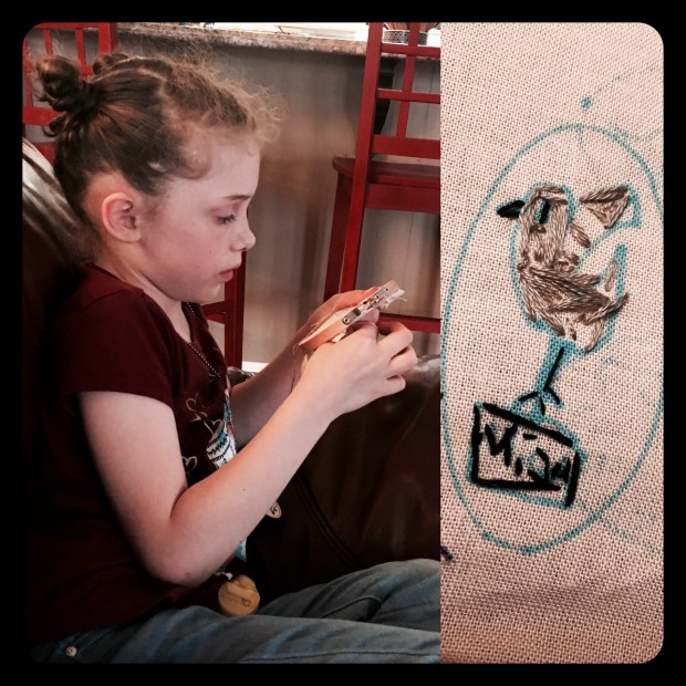 As I’ve had a wicked case o’ the ‘broideries lately, it’d be fairly unusual for the kid not to have noticed. So she asked me the other day, “hey mom, can I try?”