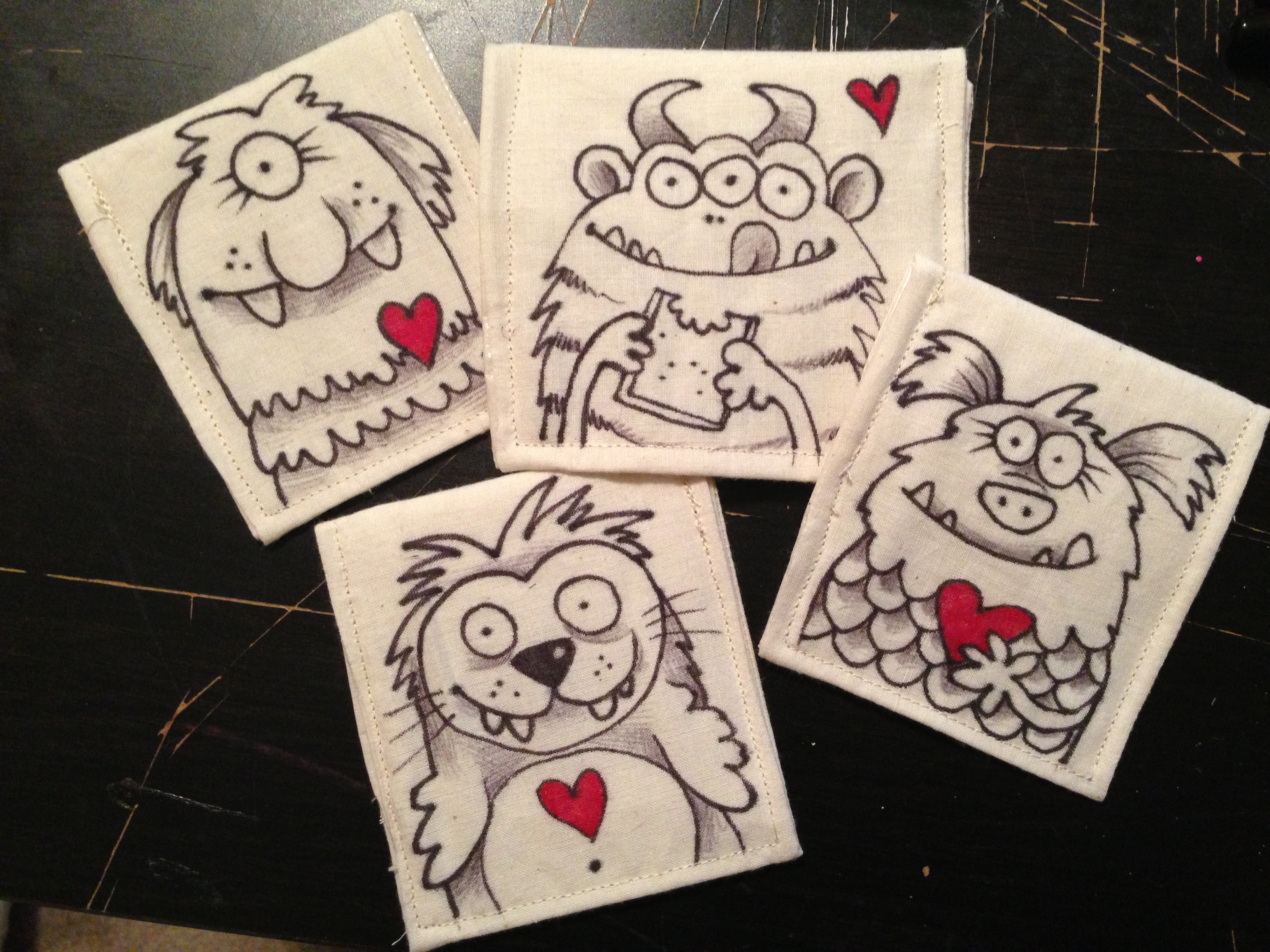 When I looked around online, there were a great many DIY options, several of which seemed quite complicated for an amateur like myself, with zippers and pulltabs and fancy fabric and such….except for one: this tutorial from Rhinestone Beagle. Our local fabric department didn’t have any of the fancy nylons I had seen in some DIYs, but they did have very inexpensive fusible vinyl, which is SUPER easy to use. You iron it on, and boom–whatever you’re making is water resistant. So that was good. Secondly, I’m not good with zippers, but I can sloppily fake some velcro like no one’s business, so score another point for this tutorial. Thirdly, I worried that certain opening fasteners would be difficult for my kid to open at lunchtime, so if I wasn’t fancy enough to put in my own zippers, I wanted one that folded over a bit. And lastly: I felt a little like I was taking the easy way out, not being able to doodle something new with every lunch. (I felt I had to live up to things like this)…I compromised by going with a plain fabric, so I could doodle some monster faces on the bags (with Sharpies, of course. …They should sponsor me).