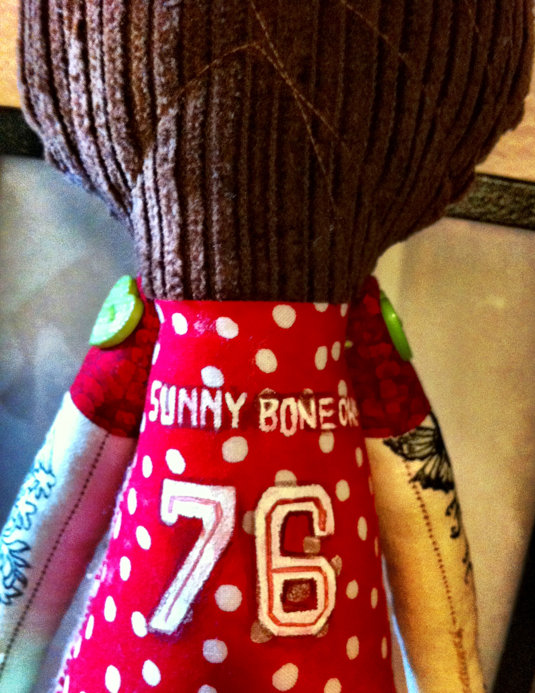 Since our colors were red, white & green, I made the bottom half a different color to look like derby shorts. She has several tattoos, but I added several more to decorate her arms all up. I used acrylic paint for her face and tattoos, which (if you’ve ever gotten it on your clothes by accident you know) stays on fabric really well.